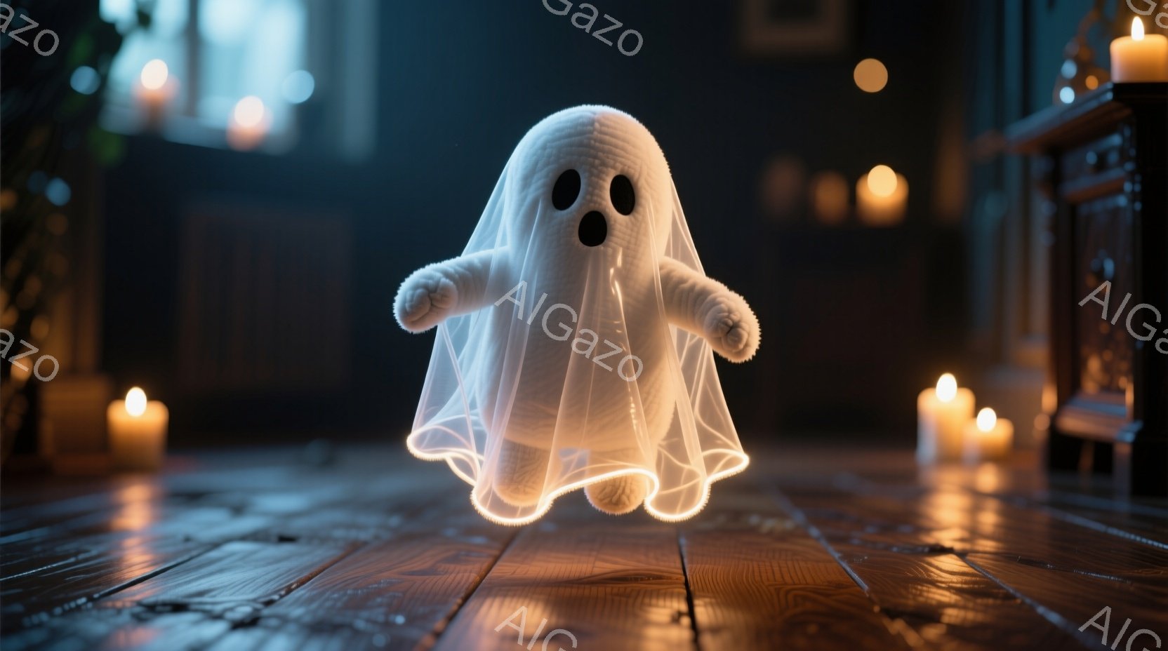 ぼんやりとした白い幽霊が、ぼやけた輪郭を持つ布で覆われている。その幽霊は木製の床の上に浮かんでおり、周囲には薄暗い光を放つロウソクが配置されている。背景は暗く、ぼやけた家具と窓が見え、全体的に不気味で幻想的な雰囲気を醸し出している。
