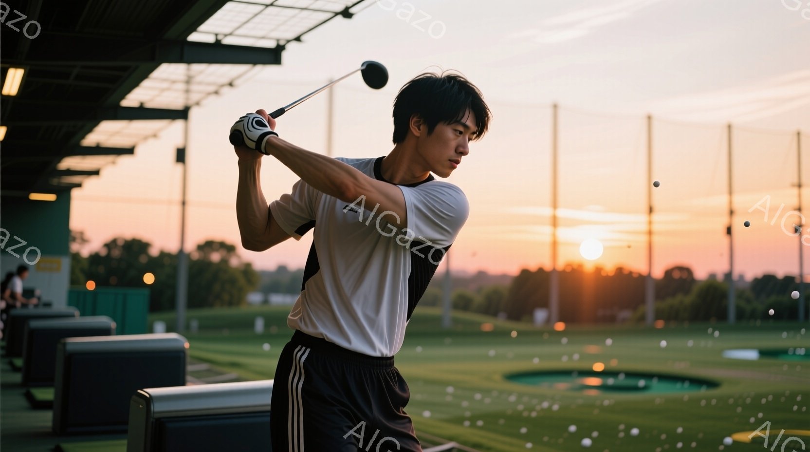 ゴルフ練習場にいる若い男性が、スイングの最中です。濃紺のシャツに黒いパンツ姿で、髪は短く整えられ、集中した表情で力強くクラブを振っています。背景には緑の芝生と、夕焼けに照らされたゴルフコース、そして遠くに見える建物が広がっており、練習場全体がオレンジ色の暖かい光に包まれています。