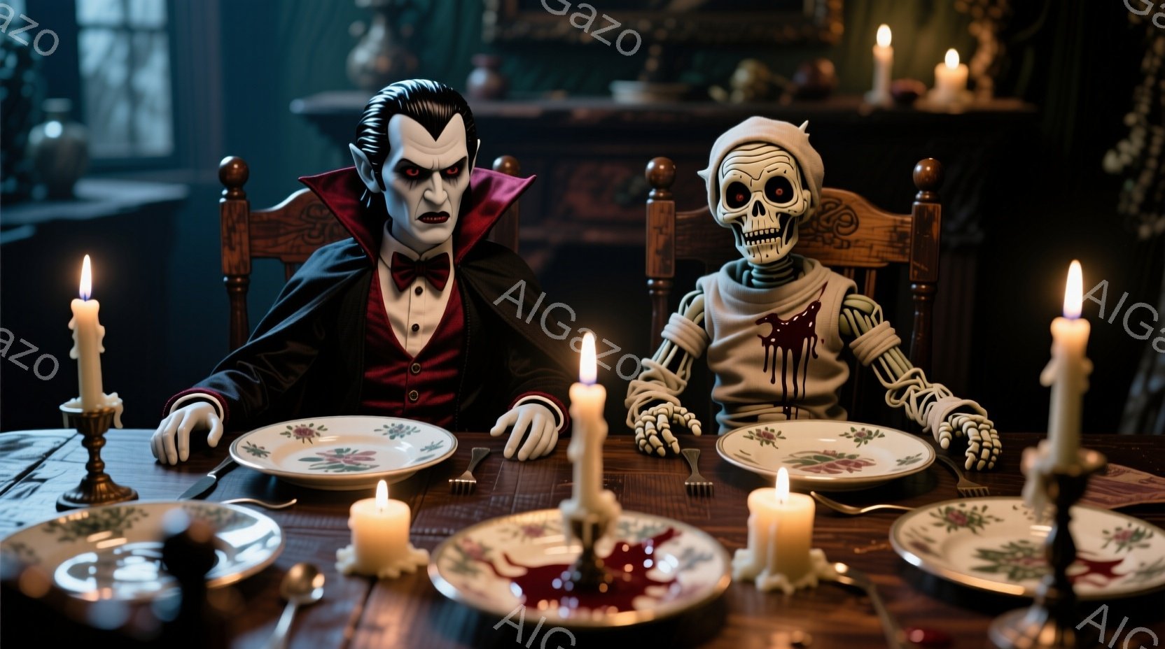 吸血鬼のような男とガイコツの男が、キャンドルが灯された長い食卓を挟んで向かい合って座っています。男は黒いスーツを着ており、整った髪型で鋭い眼光を放ち、ガイコツの男は白い服を着ており、片手にフォークを持っています。背景には、装飾が施された家具や暗い壁が見え、全体的に不気味で少しユーモラスな雰囲気です。