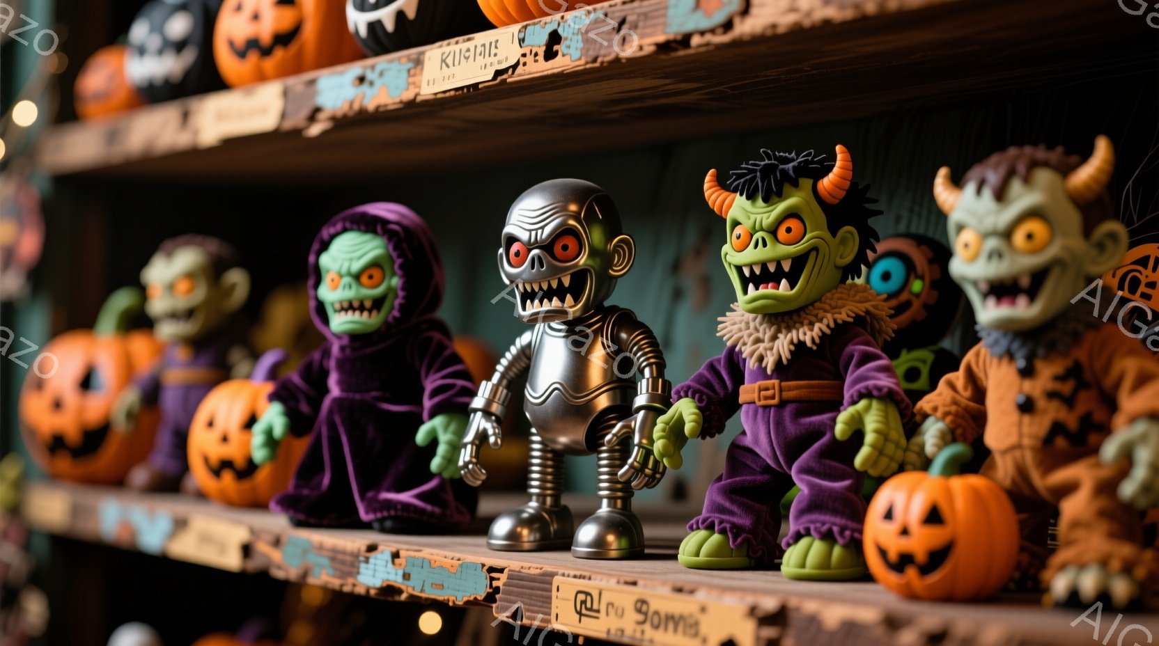 飾り棚には、ハロウィーンをテーマにしたおもちゃや置物が並べられています。紫色のモンスター、ロボット、フランケンシュタイン風のキャラクター、そしてジャック・オー・ランタンが並び、少し不気味でありながらも愛らしい雰囲気を醸し出しています。背景は暗い青色で、全体的にハロウィーンらしい雰囲気が漂っています。