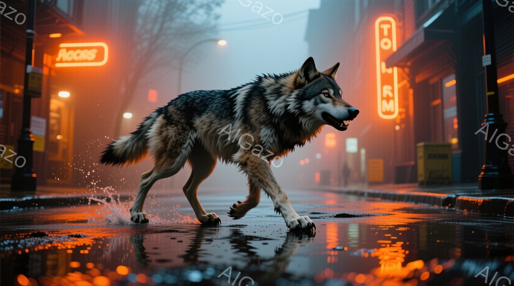 濡れたアスファルトの路上を、毛並みの美しい灰色の狼が歩いている。背景にはぼやけた都市の風景とネオンサインが点滅し、雨上がりの夜の雰囲気を作り出している。狼の表情は凛々しく、街の喧騒の中に現れた野生の姿が印象的である。