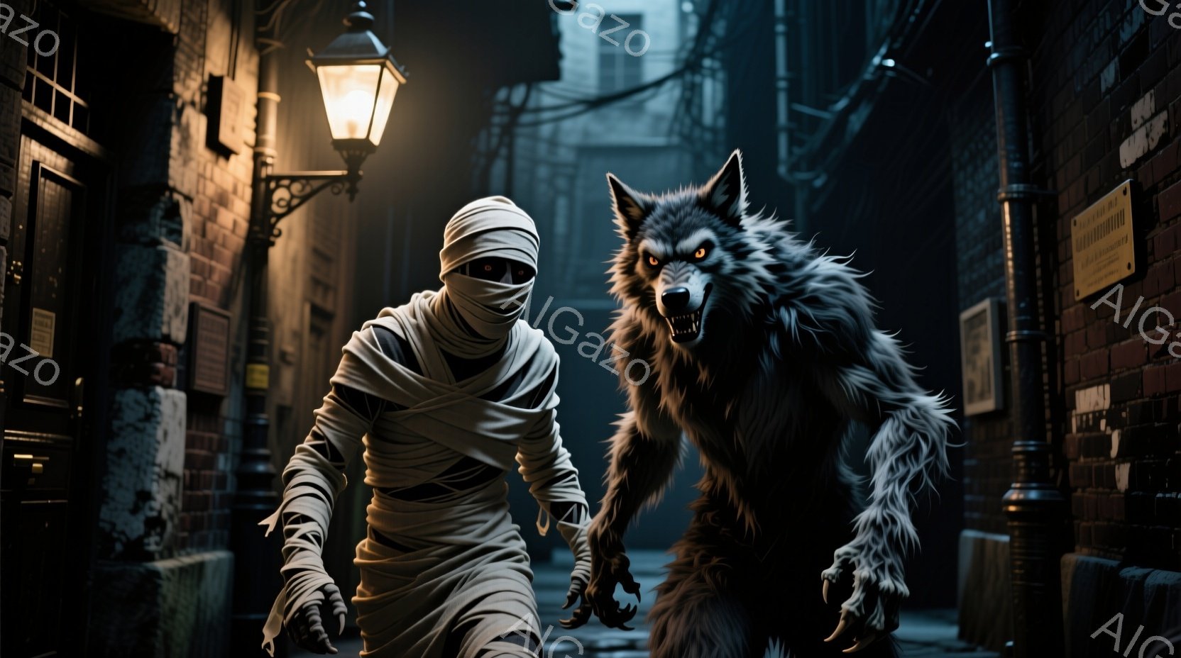 埃っぽい路地に、包帯で全身を覆ったミイラのような人物と、大きく牙をむき出した狼男が並んで立っている。ミイラは前かがみになり、狼男は片足を前に出し、獲物を狙うような姿勢で、まるで何かを追いかけているかのようである。背景にはレンガ造りの建物が並び、薄暗い路地と合わせて、不気味で緊迫した雰囲気を醸し出している。