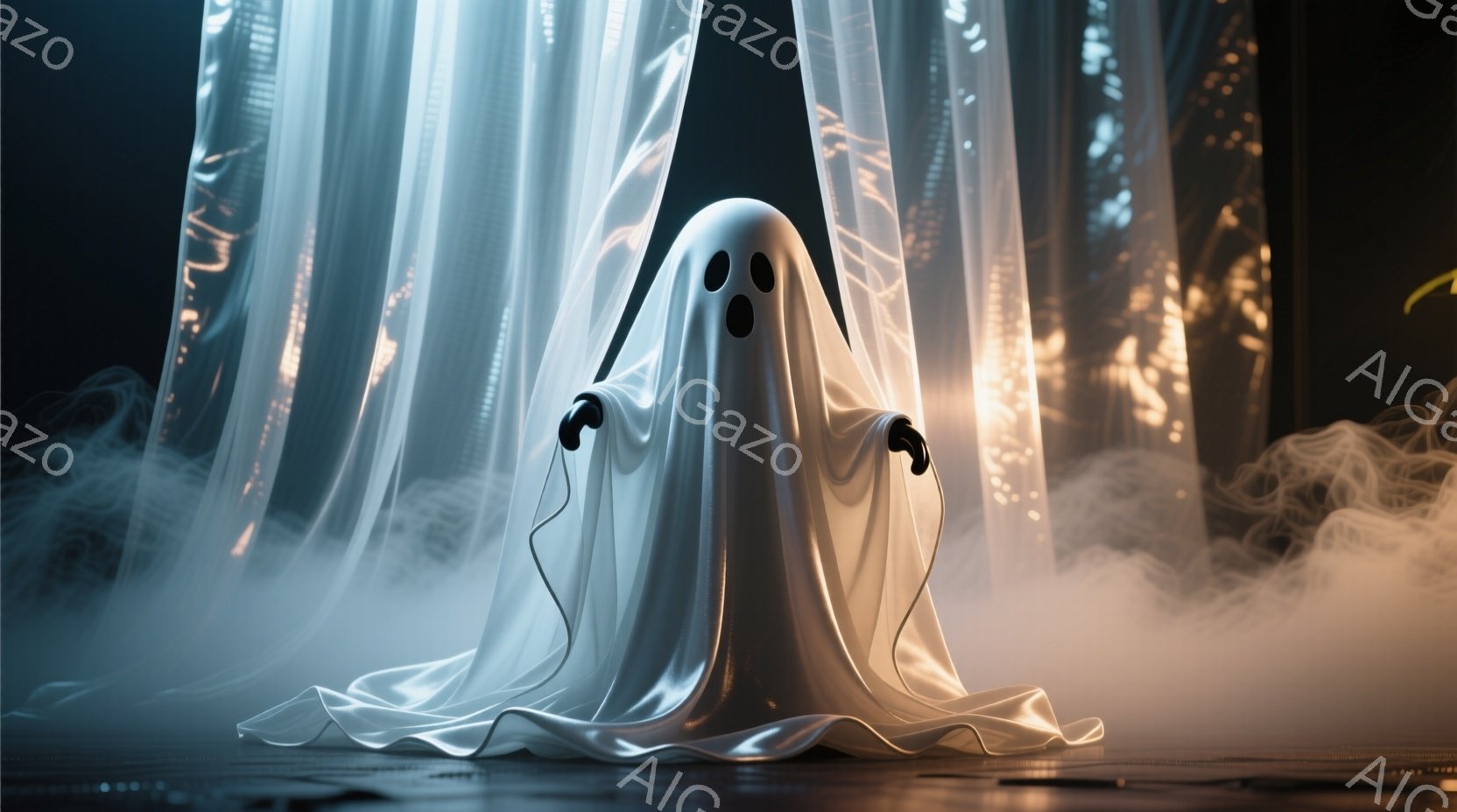 白い幽霊のような姿が、まるでシーツを被ったように立っている。目は大きく丸く、口も大きく開いていて、少しコミカルな表情をしている。背景には、ぼやけた光の帯が垂れ下がり、霧のようなものが漂っており、幻想的で少し不気味な雰囲気を醸し出している。