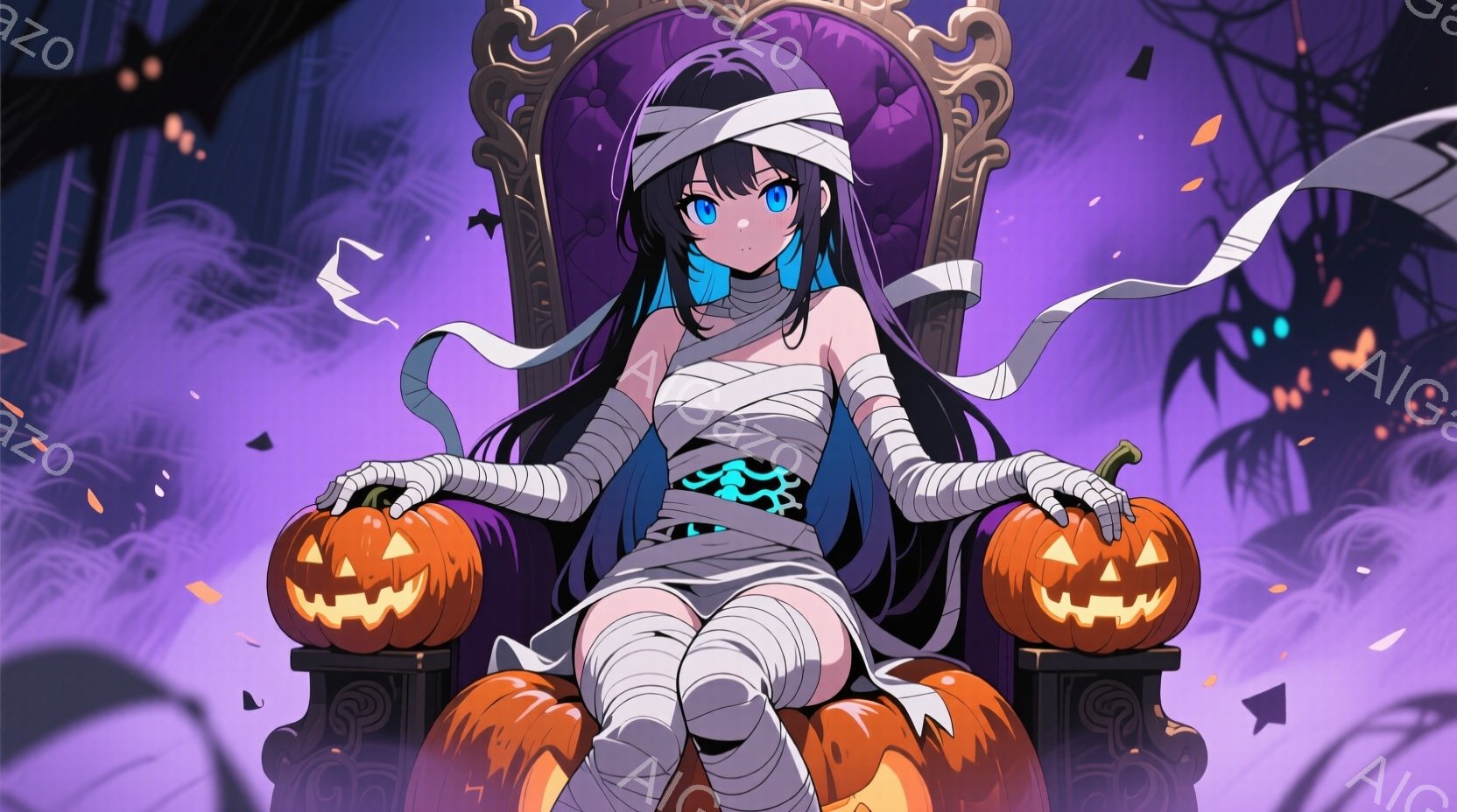 紫色の背景に、ミイラの衣装を身につけた少女が、装飾的な椅子に座ってこちらを見つめています。彼女は黒い髪を肩まで伸ばし、目は鮮やかな水色で、少しいたずらっぽい表情を浮かべています。背景には、カボチャのランタン、お化け、そして暗いシルエットの建物が浮かび、ハロウィンの夜の不気味で楽しい雰囲気を醸し出しています。
