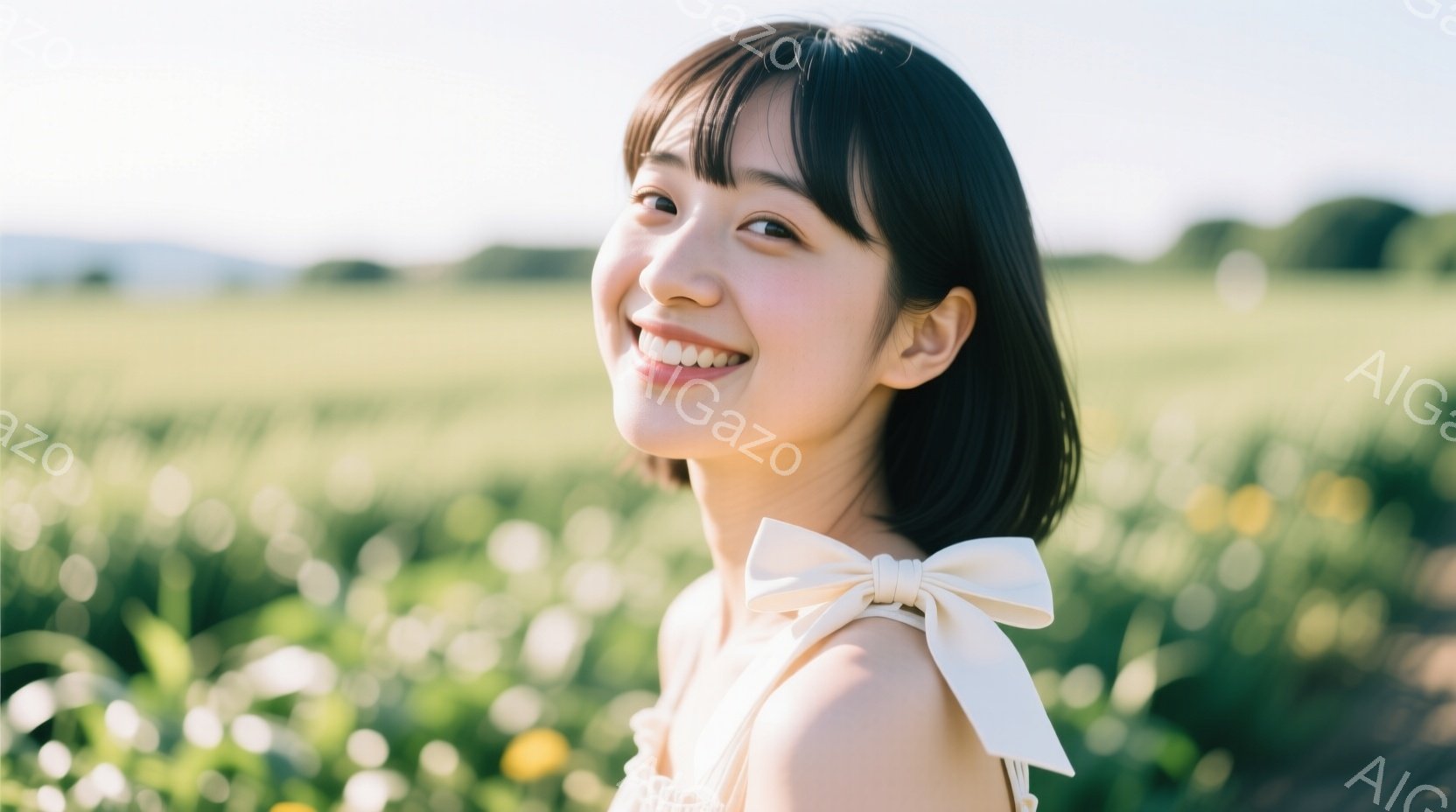 若い女性が、緑豊かな野原で微笑んでいる。彼女は肩出しの白いドレスを着ており、大きなリボンが背中で結ばれている。背景にはぼやけた緑の丘と青空が広がり、全体的に明るく穏やかな雰囲気が漂う。