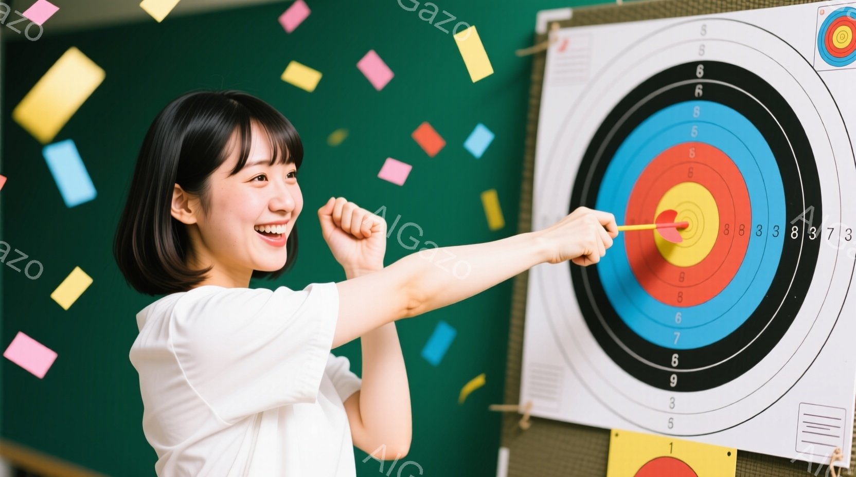 若い女性がダーツボードに向かってダーツを投げている様子が写っています。彼女は白いTシャツを着ており、明るい笑顔を浮かべています。背景は緑色で、カラフルな紙吹雪が舞っており、全体的に明るく活気のある雰囲気が漂っています。