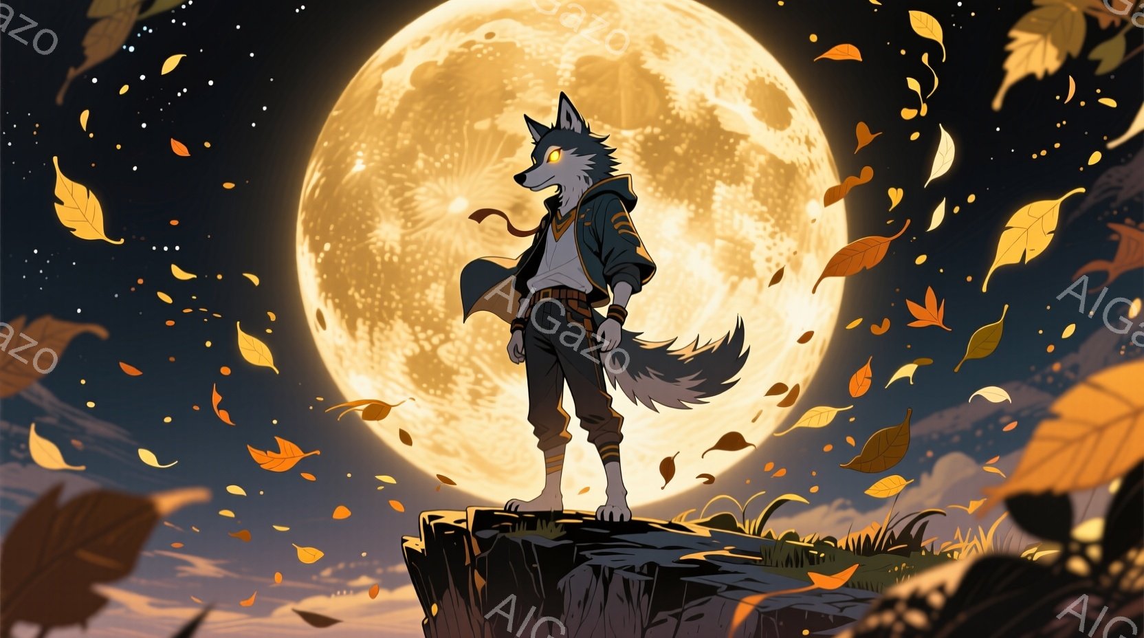 灰色の毛並みを持つ獣人男性が、切り立った崖の上に立っている。黒いパーカーと短いズボンを身につけ、腰にはベルトを巻いている。背景には満月が輝き、落ち葉が舞い散る秋の夜空が広がっており、物悲しいながらも力強い雰囲気を醸し出している。