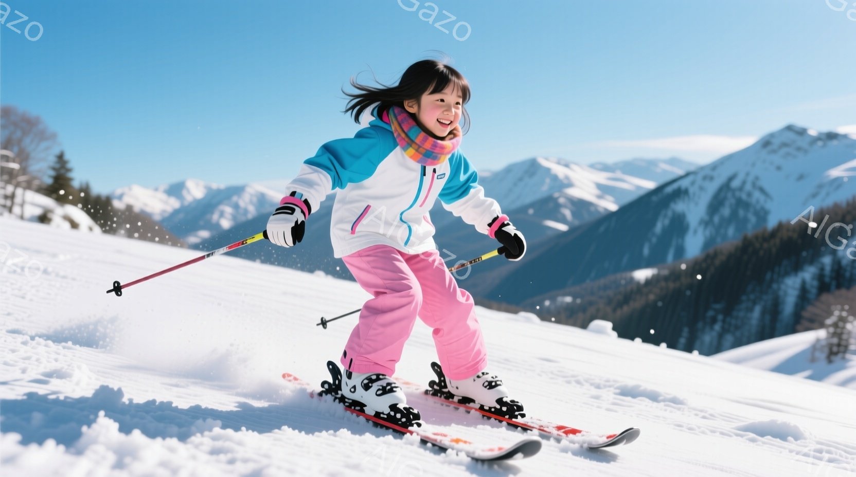 雪山をスキーで滑走する少女が写っています。ピンク色のスキーウェアに白と黒のジャケット、髪はポニーテールにされており、笑顔で滑っている様子が伝わってきます。背景には雪を頂いた山々と針葉樹林が広がり、晴天の下、爽やかな冬の雰囲気が漂っています。