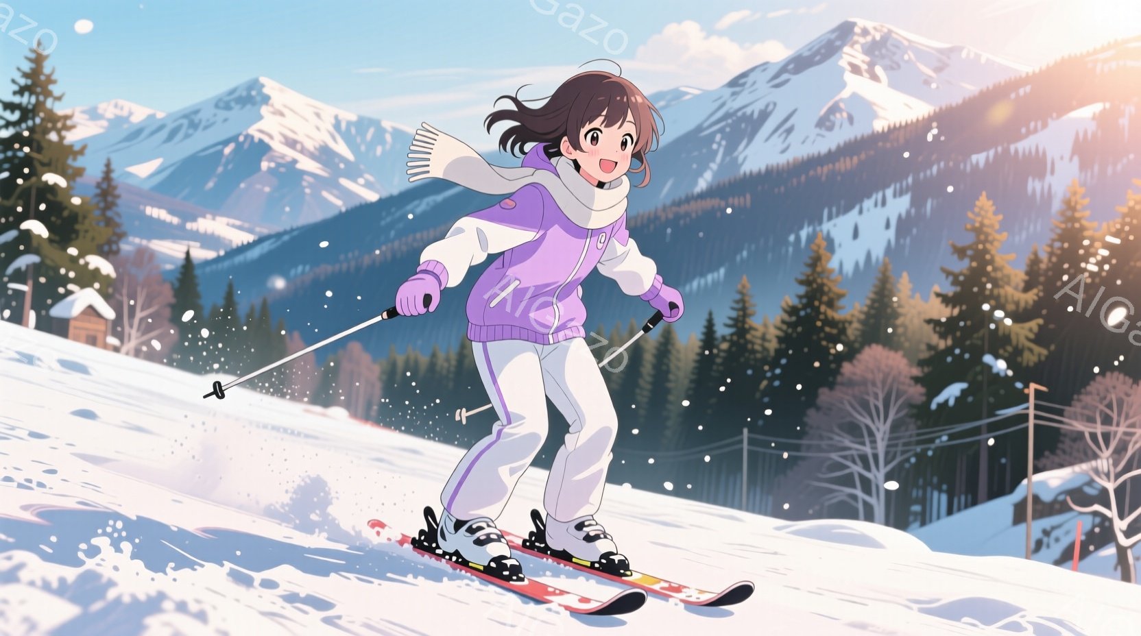 スキーウェアを着た少女が雪山を滑走している様子が描かれている。ピンクと紫色のスキーウェアに、長い茶色の髪をなびかせ、笑顔で滑っている。背景には雪をまとった山々と森林が広がり、晴天の下、爽やかな冬の景色が広がっている。