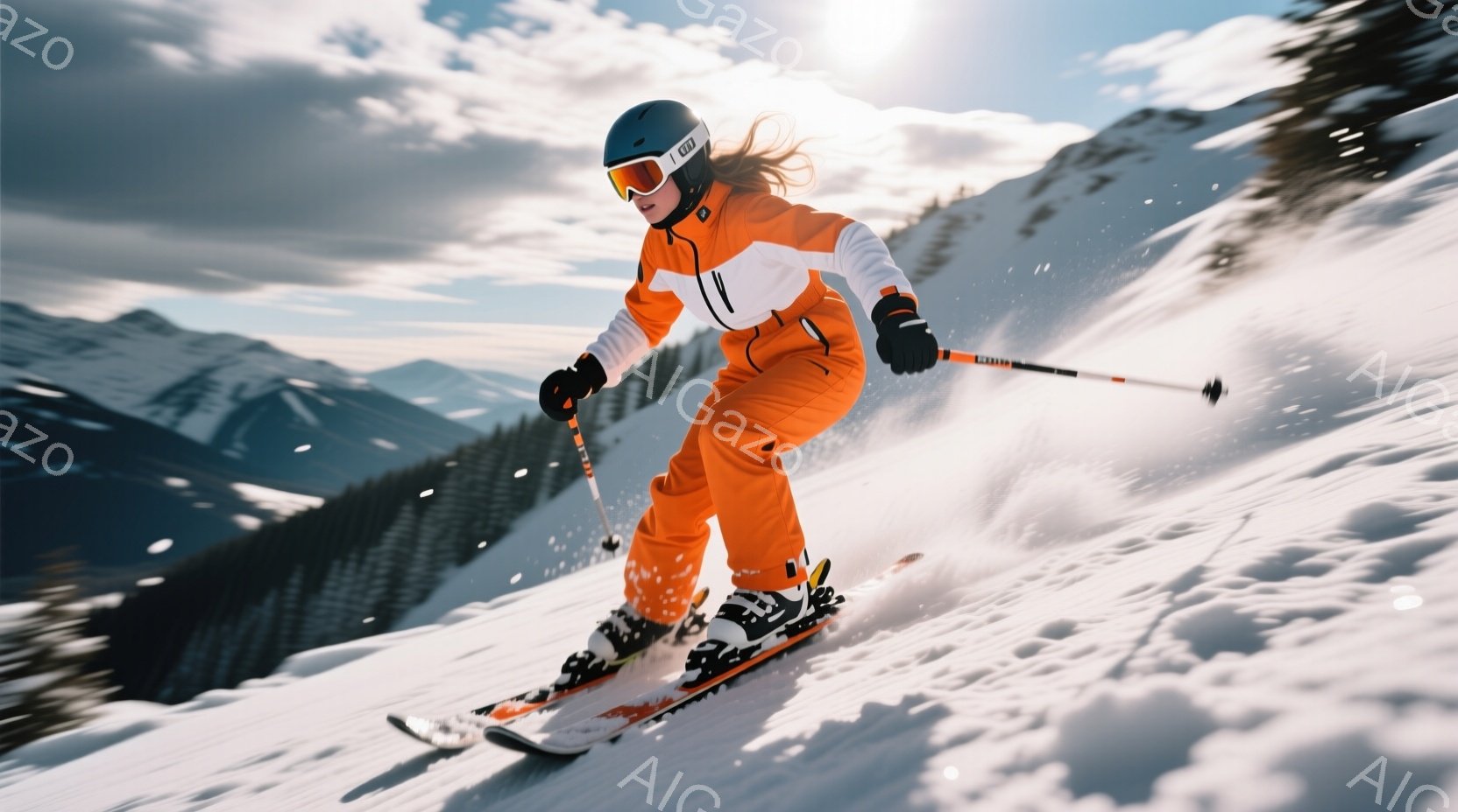 オレンジ色のスキーウェアに身を包んだ女性が、雪山を滑走している。髪は後ろで三つ編みにされ、ヘルメットとゴーグルを着用し、スピード感あふれる滑りをしている。背景には雪をまとった山々が広がり、晴天のもと、爽やかな冬の雰囲気が漂っている。