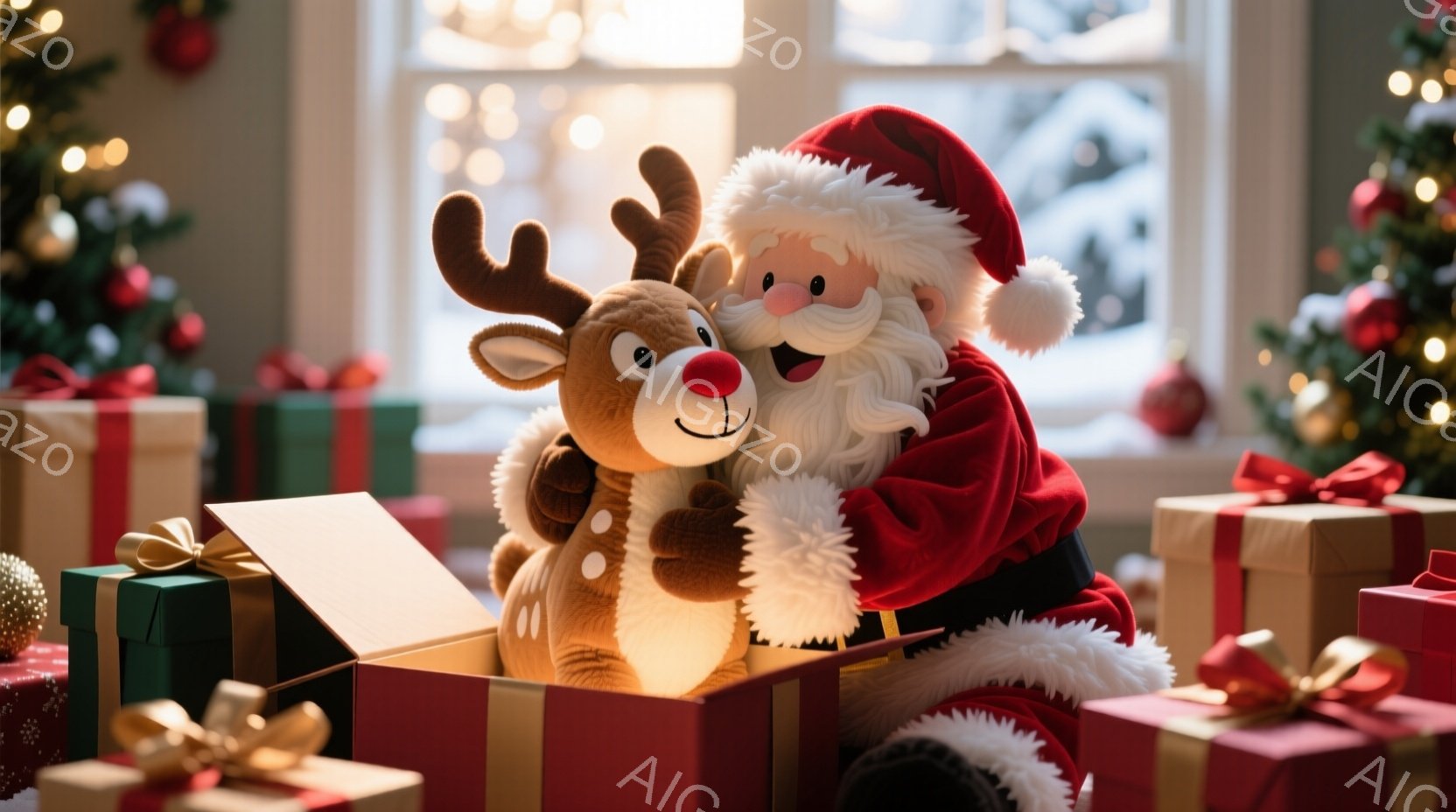 サンタクロースが、大きな赤いギフトボックスから顔を出し、柔らかそうなトナカイのぬいぐるみと抱き合っています。サンタは赤いベルベットの衣装に黒いベルトを締め、白いひげと明るい笑顔を見せています。背景には、他のギフトボックスとキラキラ光るクリスマスツリーがあり、暖かくお祝いの雰囲気です。