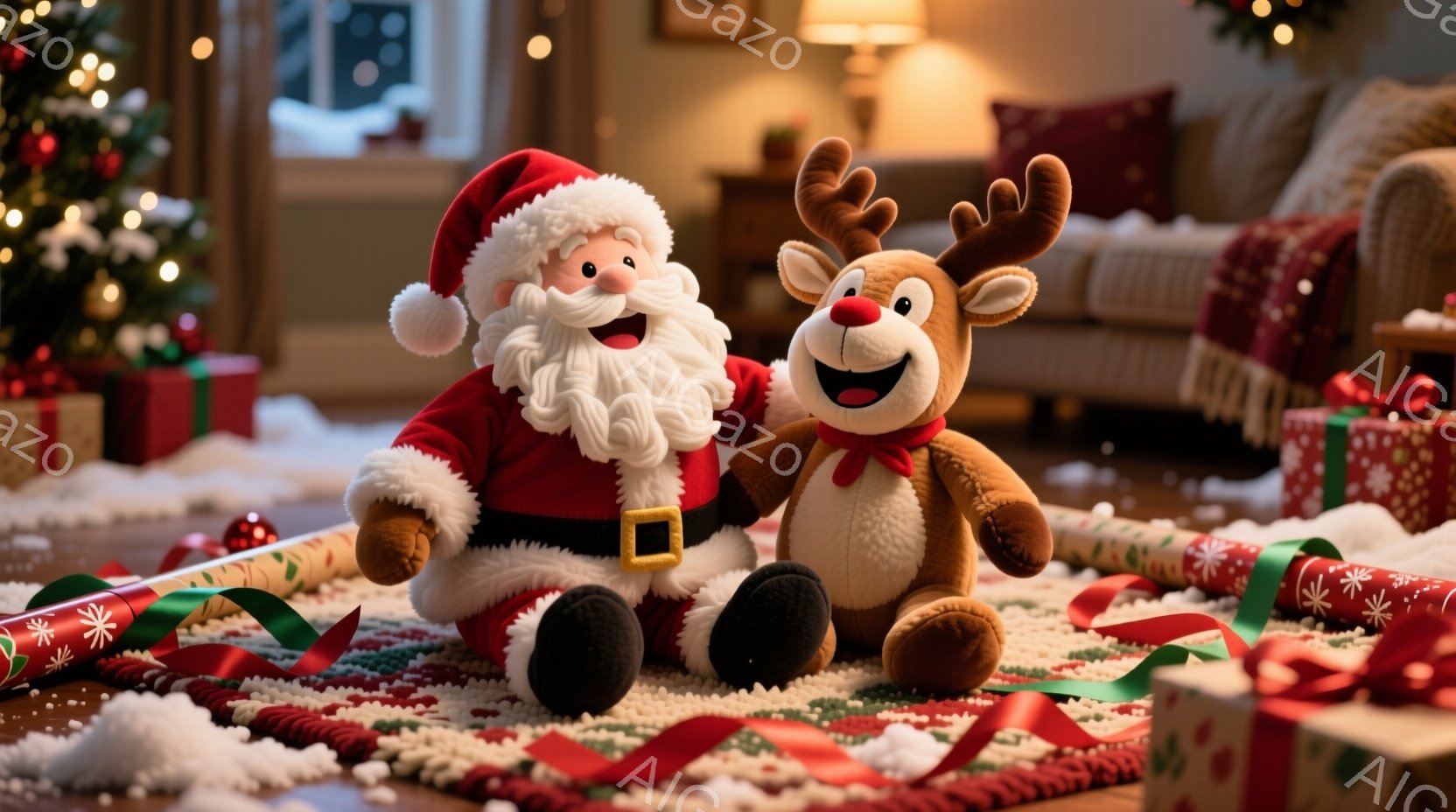 サンタクロースは赤い衣装に白いトリミングが施され、笑顔でプレゼントの箱を持ち上げています。箱の中から飛び出すように、可愛らしいトナカイの人形が描かれており、背景にはクリスマスツリーやキャンドルが暖かく灯っています。雪が舞う室内は、温かく幸せなクリスマスの雰囲気に満ちています。