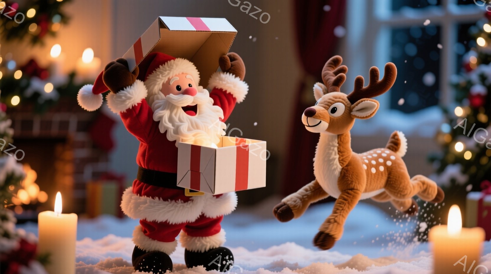 サンタクロースは赤い服と白い毛皮のトリミングが施された衣装を着ており、満面の笑みを浮かべて大きなプレゼントの箱を開けています。箱の中には光が輝いており、背景にはクリスマスツリーやキャンドルが飾られ、雪が舞う暖かくお祝いムードの室内が広がっています。トナカイは雪の上を駆け抜けており、全体的に心温まる、お祭りの雰囲気が漂う画像です。