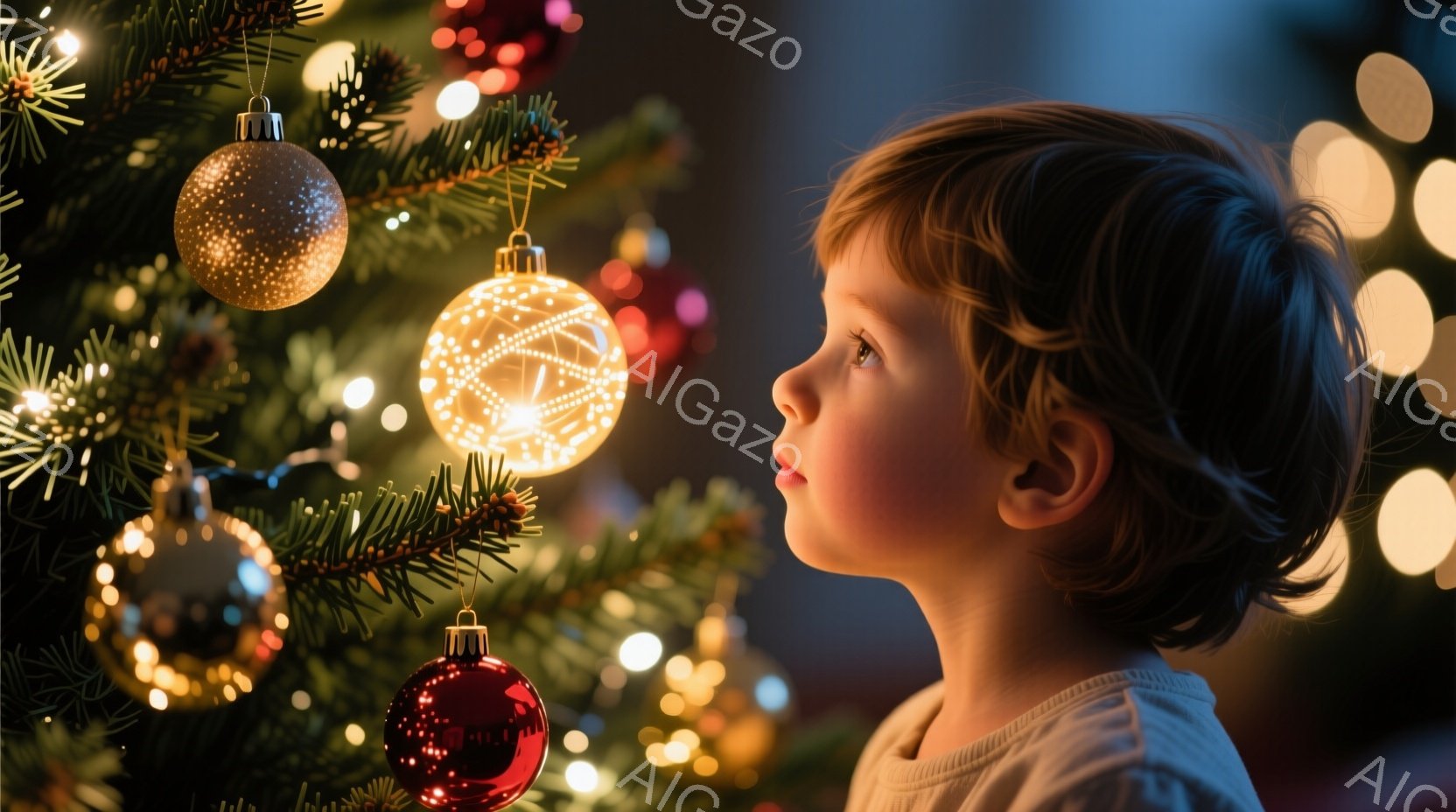 クリスマスツリーの近くにいる幼い少年が写っている。彼はチェック柄のセーターを着ており、巻き毛の髪型で、どこかを見つめるような表情をしている。背景にはぼやけたクリスマスツリーの飾りと光が溢れており、温かく幻想的な雰囲気を醸し出している。