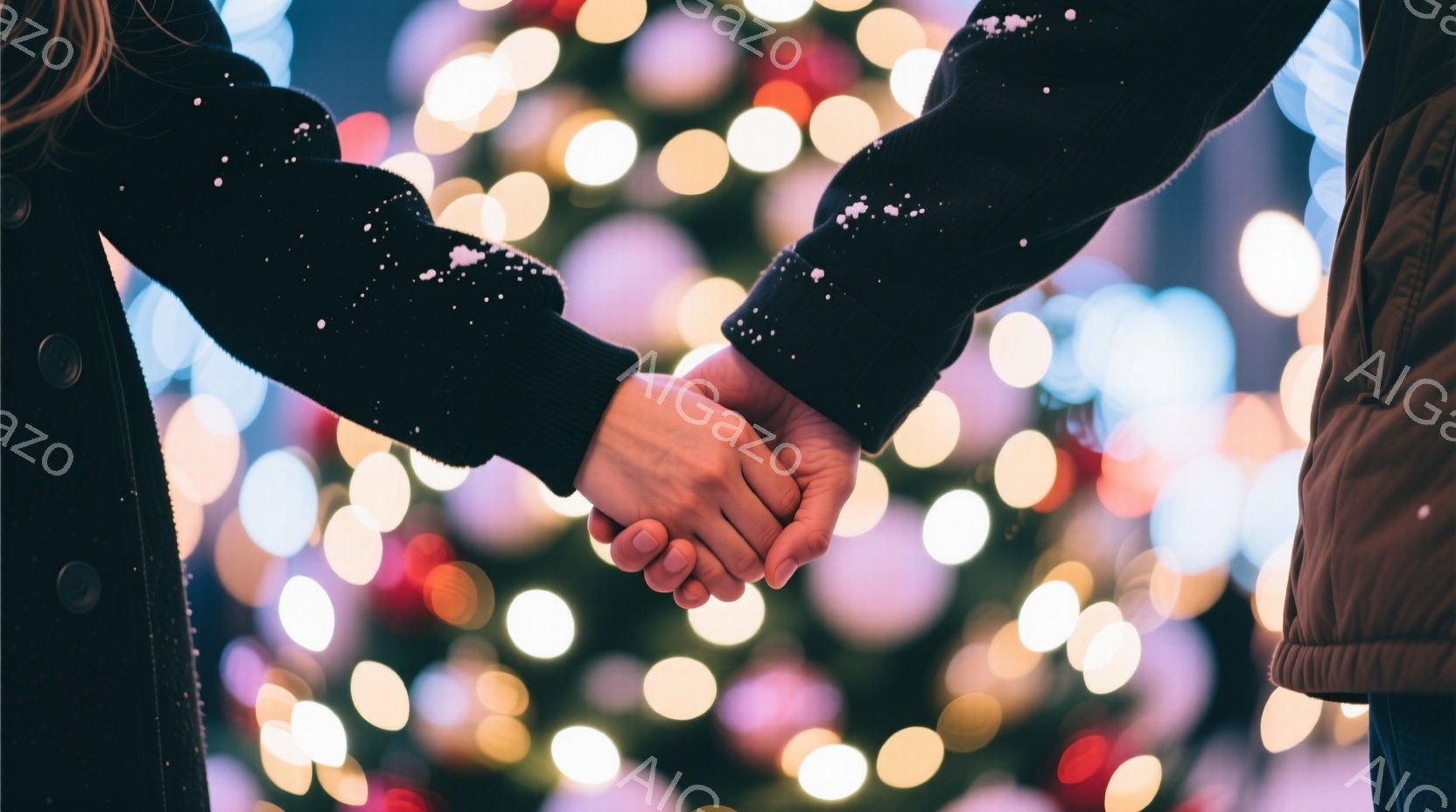 暖色系のぼやけた背景を背景に、二人の人物が手をつないでいます。片方の人物はベージュ色のジャケット、もう片方の人物は黒いジャケットを着ており、手をつないだ姿が強調されています。背景は多くの丸い光で構成されており、ロマンチックで暖かい雰囲気を醸し出しています。