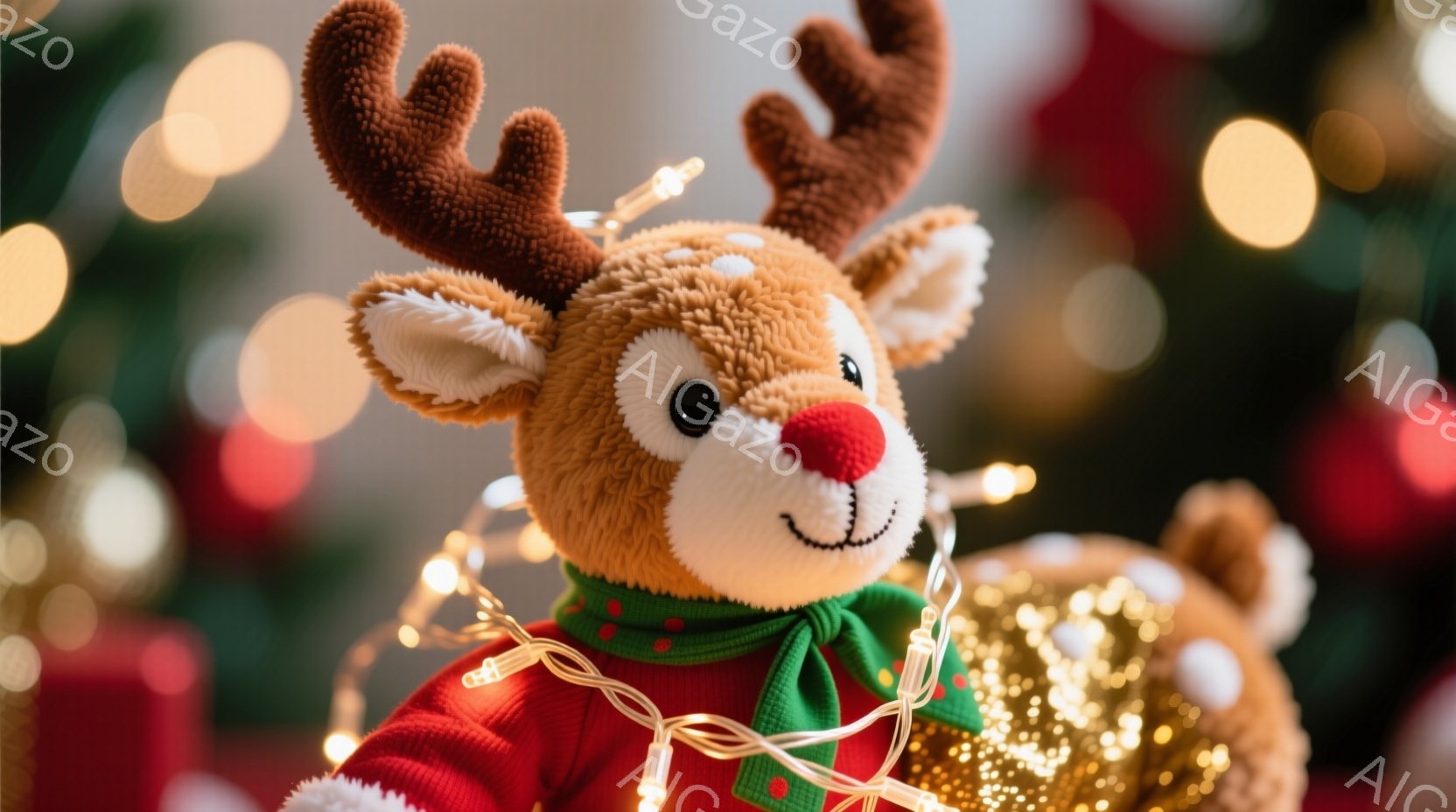 ふわふわの茶色のトナカイのぬいぐるみは、赤い首輪と緑のニットのショールを身に着けており、かわいらしい表情をしています。背景にはぼやけたクリスマスツリーと、暖かく輝くイルミネーションが散りばめられています。全体的に、温かく、お祝いの雰囲気で、クリスマスの季節らしさを感じさせます。