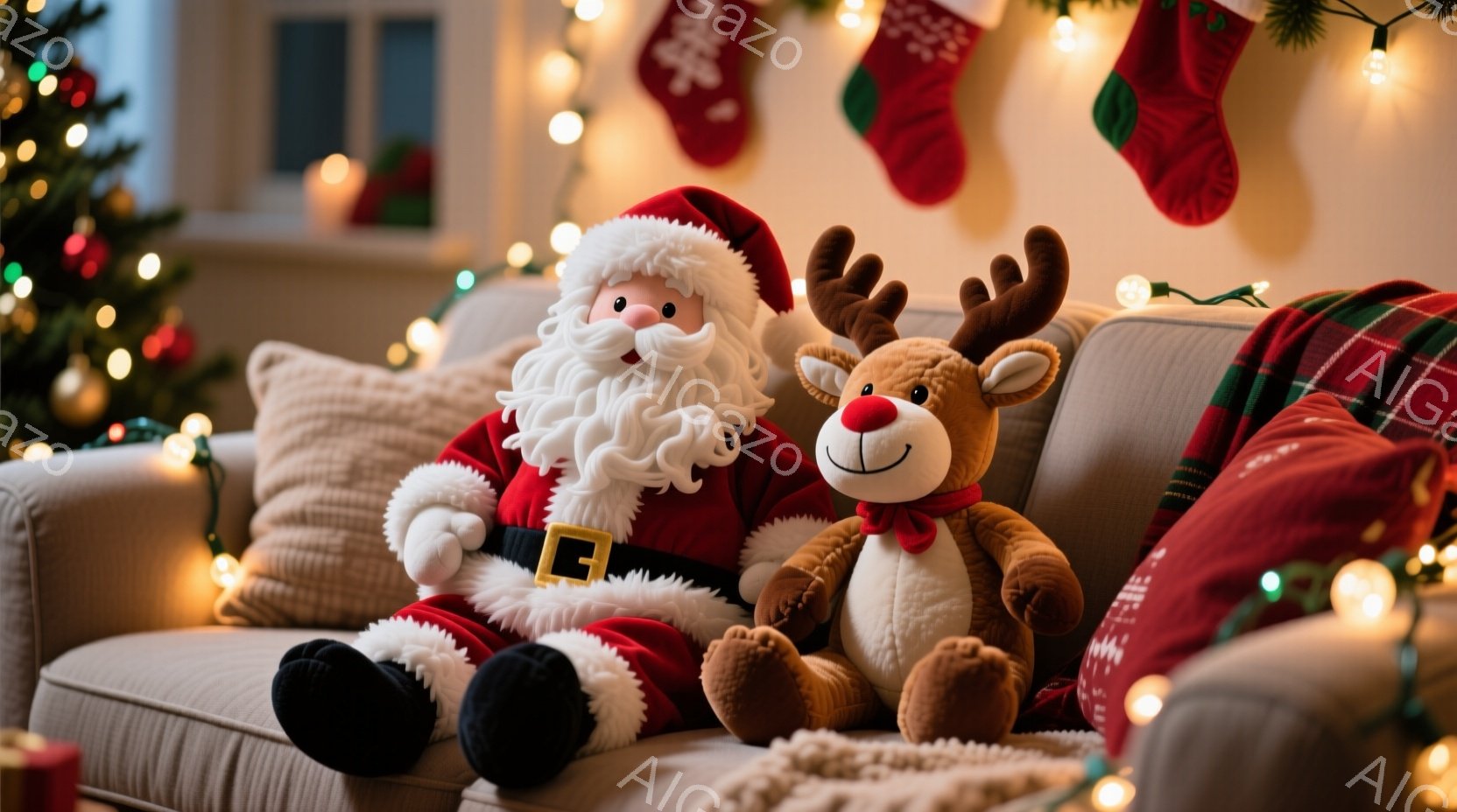 サンタクロースがソファに座り、膝に大きなトナカイのぬいぐるみを抱えています。彼は赤い衣装、白いひげ、そして優しい笑顔を見せており、リラックスした雰囲気を醸し出しています。背景にはクリスマスツリーや装飾が飾られ、暖かく穏やかな祝祭の雰囲気が漂っています。