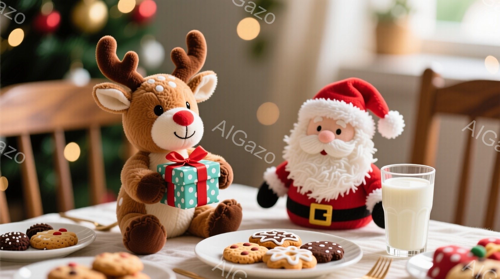 茶色いトナカイのぬいぐるみとサンタクロースのぬいぐるみがダイニングテーブルを囲んでいます。トナカイは緑色のリボンで結ばれたプレゼントを抱え、サンタクロースは明るい笑顔を浮かべています。テーブルの上にはクッキーが盛られた皿と、グラスに入った牛乳が置かれ、背景にはぼやけたクリスマスツリーが見え、温かくお祝いの雰囲気が漂っています。