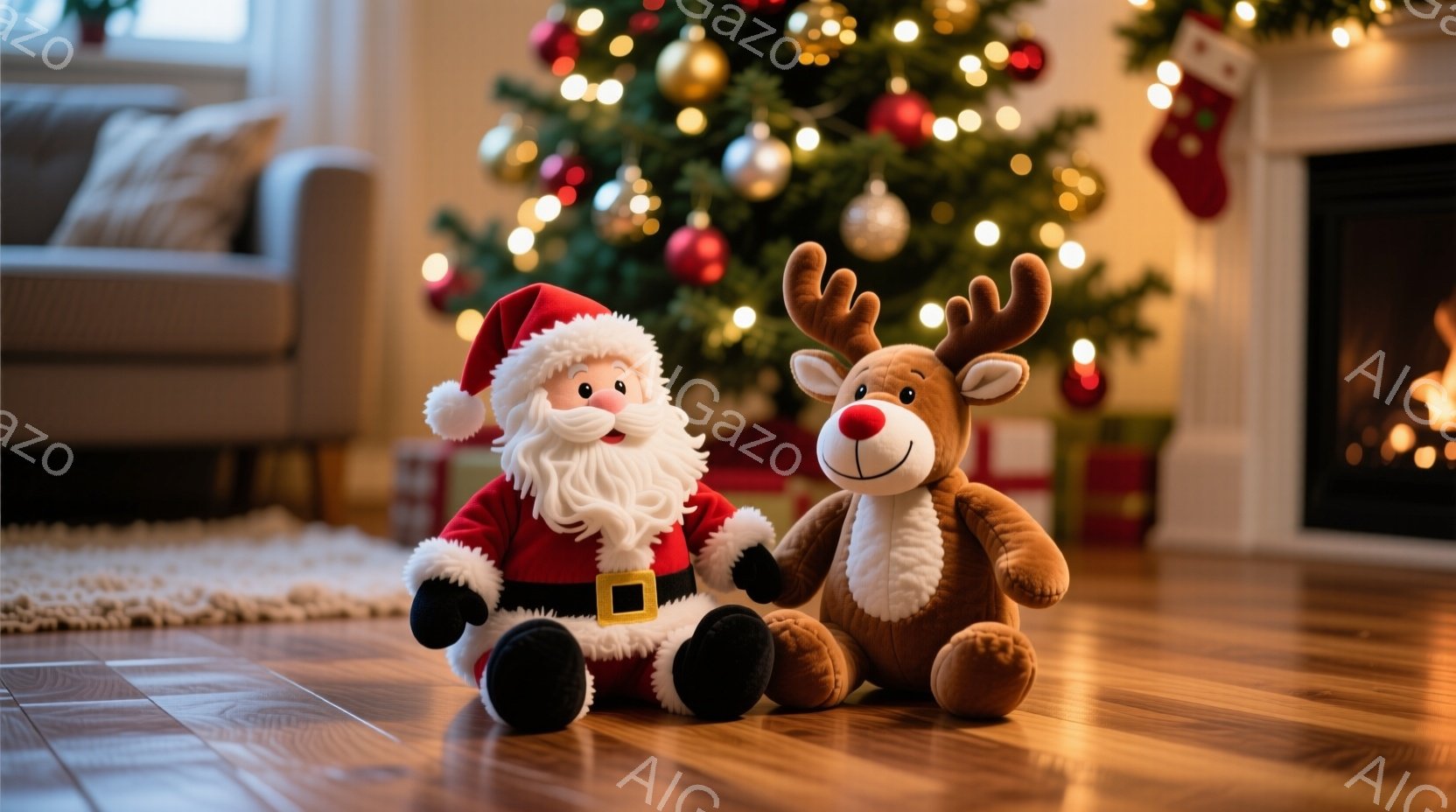 暖炉のそばに、サンタクロースとトナカイのぬいぐるみがあべこべに座っています。サンタクロースは赤いベルベットの衣装と白いひげを着て、優しい表情をしています。背景には、キラキラと輝くクリスマスツリーと、贈り物、そして暖炉が見え、温かく、お祝いの雰囲気が漂っています。