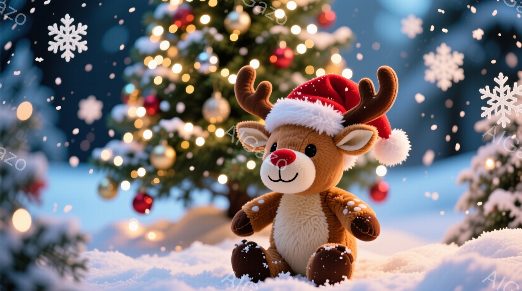 ふわふわの茶色のトナカイのぬいぐるみは、赤いサンタの帽子をかぶり、雪の上に座っています。明るい笑顔と小さな赤い鼻が可愛らしく、クリスマスの飾り付けがされた背景が暖かく、お祝いの雰囲気を醸し出しています。背景には、ぼやけたクリスマスツリーの飾りと雪が舞う様子が見られ、冬の暖かく幸せな情景が表現されています。