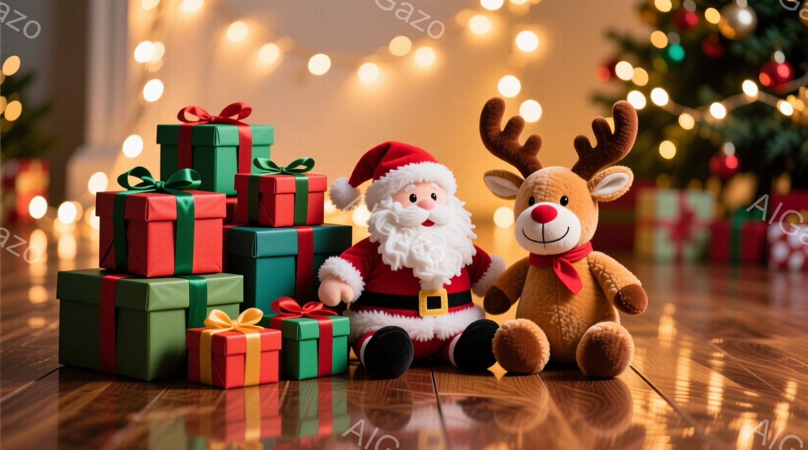 豪華なプレゼントの山を背景に、サンタクロースの人形とトナカイのぬいぐるみが座っています。サンタクロースは赤い帽子と服を着ており、白いひげと優しい笑顔を浮かべています。背景にはキラキラと輝く光の飾りがあり、温かくお祝いの雰囲気を醸し出しています。