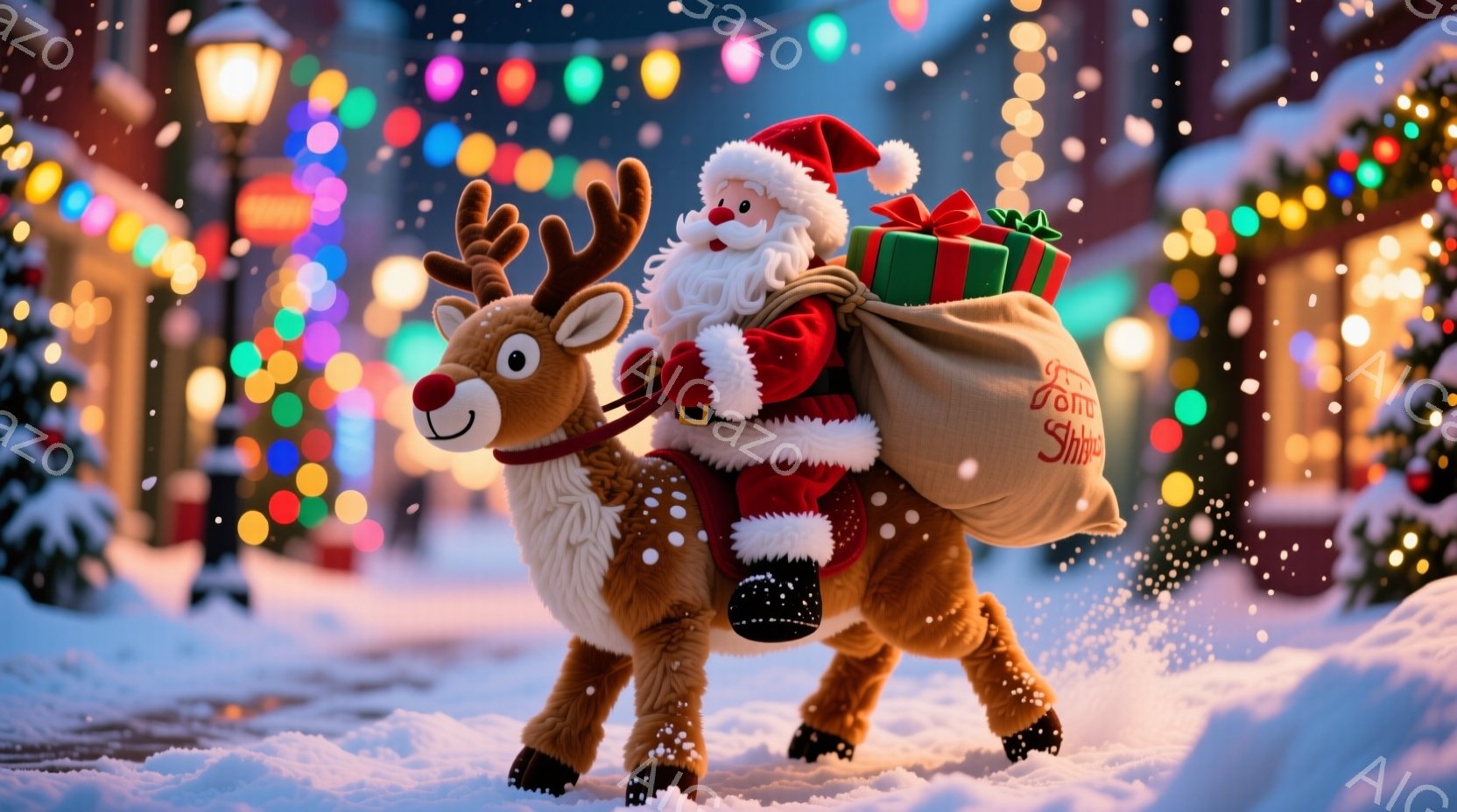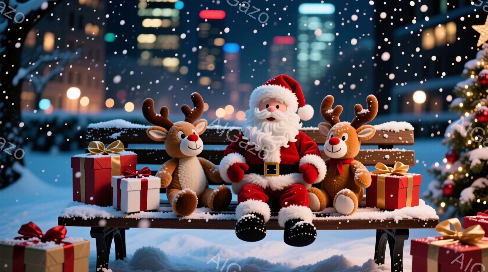 雪が降り積もる夜、プレゼントの箱に囲まれたサンタクロースと2匹のトナカイのぬいぐるみたちが、木製のベンチに座っています。サンタクロースは赤い衣装に白いひげを生やし、トナカイは愛らしい表情で、まるで人間のようにリラックスしたポーズをとっています。背景にはぼんやりと夜景が広がり、全体的に温かく、祝祭的な雰囲気が漂っています。
