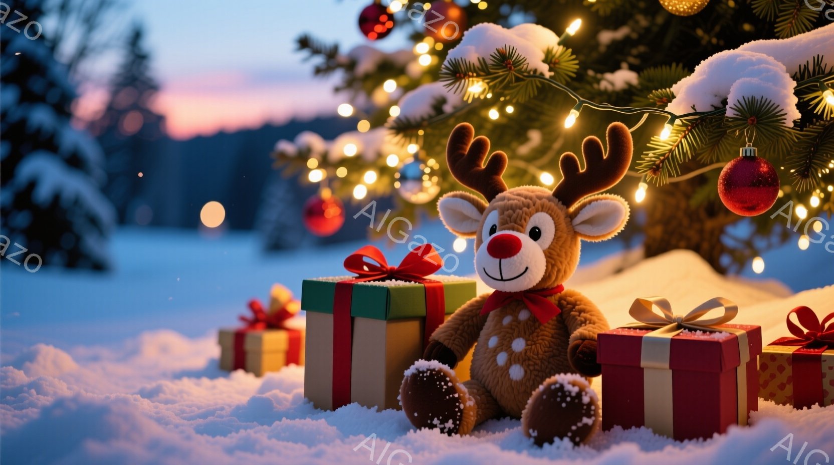雪景色の中に、ぬいぐるみのトナカイがプレゼントの箱の間に座っています。トナカイは茶色の毛並みで、赤い鼻と大きな角を持ち、穏やかな笑顔を浮かべています。背景には、電飾で飾られたクリスマスツリーがあり、夕焼け空と雪原が広がり、暖かく穏やかなクリスマスの雰囲気を醸し出しています。