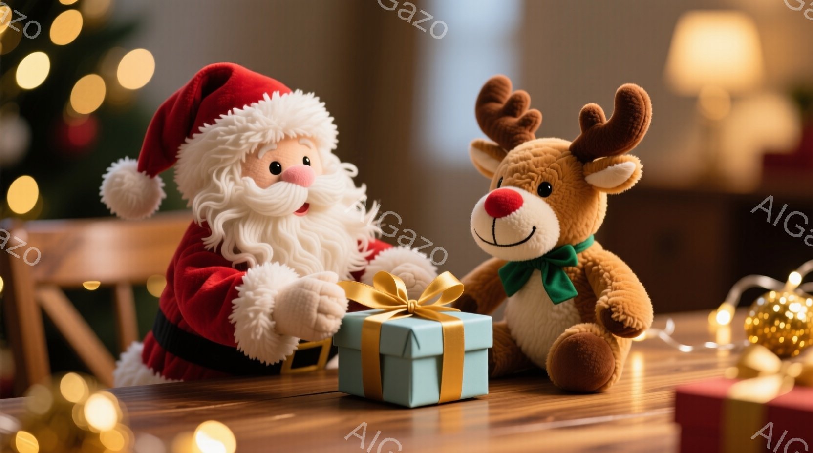 暖炉の光が差し込む木製のテーブルの上で、サンタクロースの人形とトナカイの人形がプレゼントの箱を囲んでいます。サンタクロースは赤い衣装を着て白いひげを蓄え、トナカイは茶色の毛並みに緑のリボンをつけており、どちらも優しい笑顔を浮かべています。背景にはぼやけたクリスマスツリーの光が見え、温かく穏やかなクリスマスの雰囲気が漂っています。
