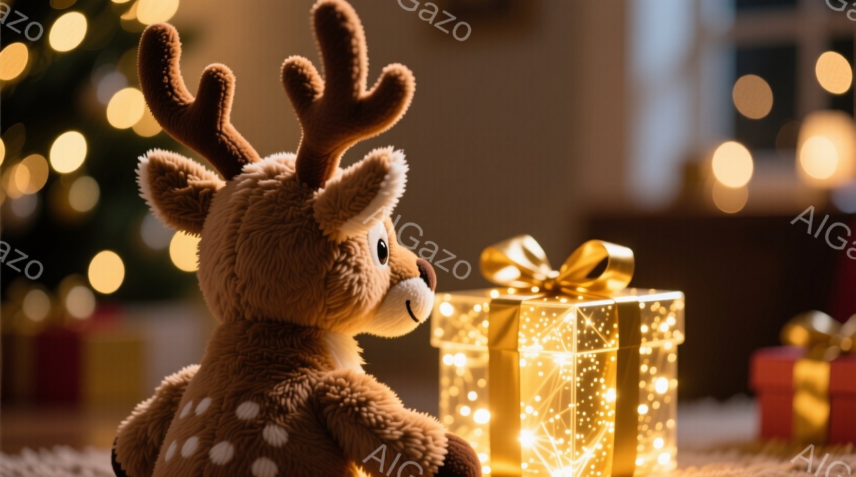柔らかい茶色の毛並みを持つ、愛らしい子鹿のぬいぐるみは、白い襟を付けています。背景には、温かい光を放つプレゼントボックスと、ぼやけたクリスマスツリーのライトが散りばめられています。全体的に温かく、お祝いの雰囲気が漂い、特別な日の喜びが感じられます。