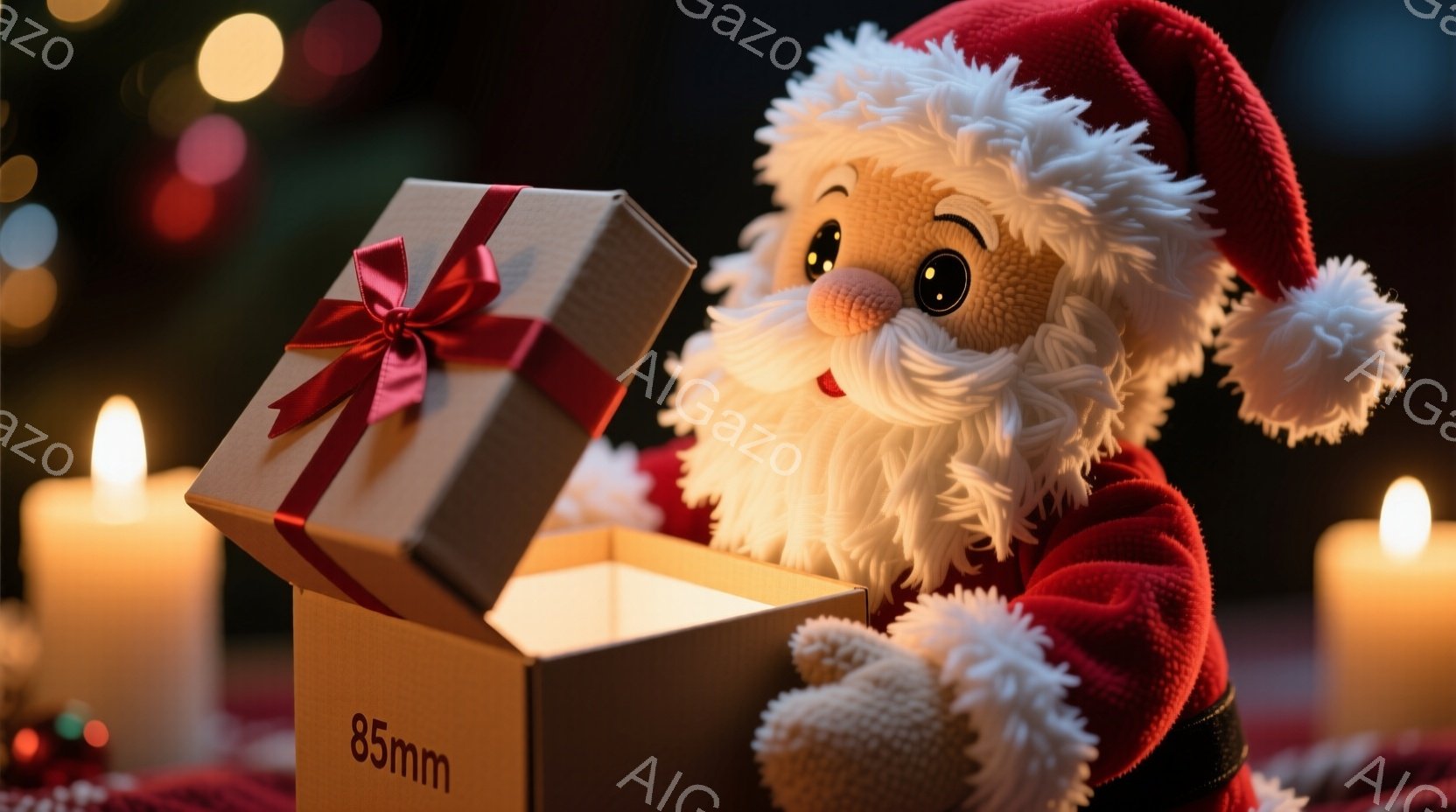 はい、承知いたしました。画像の詳細な説明を以下に示します。 、サンタクロースの人形が箱の中から顔を出している様子を捉えています。サンタは赤い帽子と衣装を身につけ、白いひげを生やし、にっこりとした表情をしています。背景にはぼやけたキャンドルやキラキラした光があり、暖かく幻想的な雰囲気を醸し出しています。