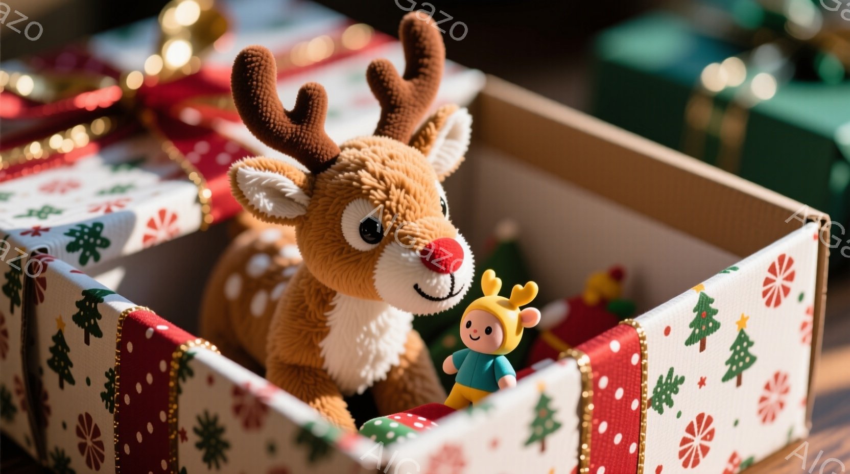 この無料AI生成画像「ぬいぐるみのアラ鹿と黄色い鳥のおもちゃが、花柄のリボンで飾られた段ボール箱の中にいます。アラ鹿はふわふわの茶色の毛並みで、大きな目と赤い鼻が特徴的です。背景は自然光に照らされた屋外で、箱は地面に置かれています。」は、2025年10月28日に作成されました。 サイズは 1664×928px の高解像度で、商用利用も可能なフリー素材として提供しています。