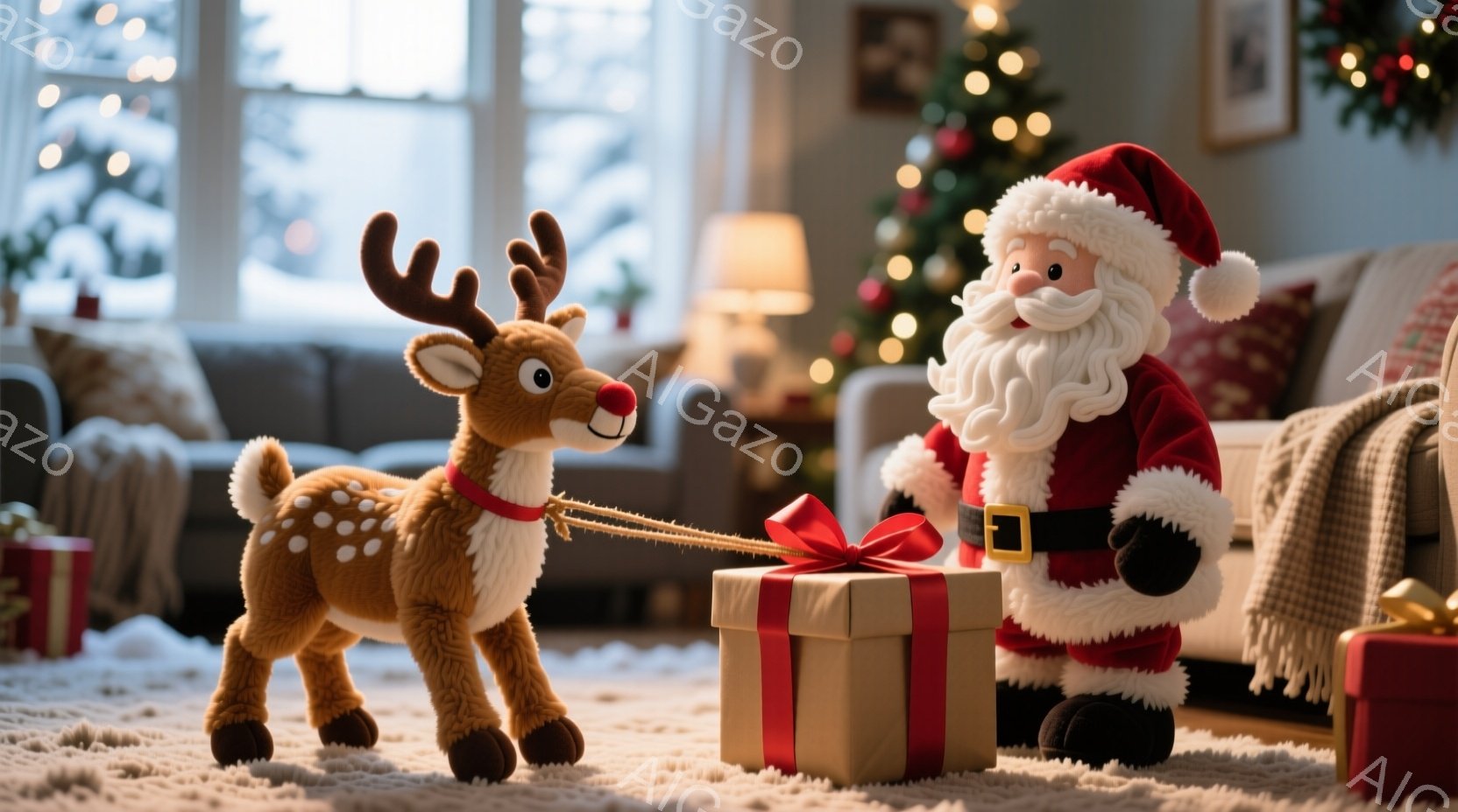 暖炉のあるリビングルームで、サンタクロースがプレゼントの箱の前に立っています。彼は赤い衣装と帽子を身につけ、白いひげを生やしており、にっこりと微笑んでいます。背景にはクリスマスツリーが飾られ、雪が降る冬の景色が見えます。