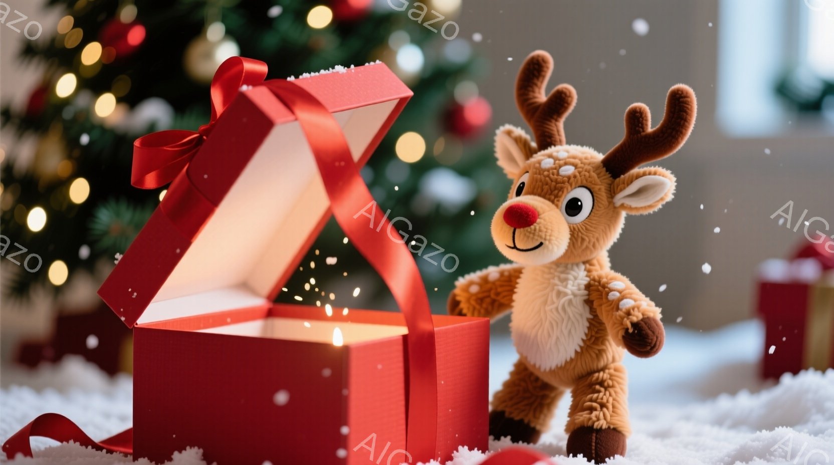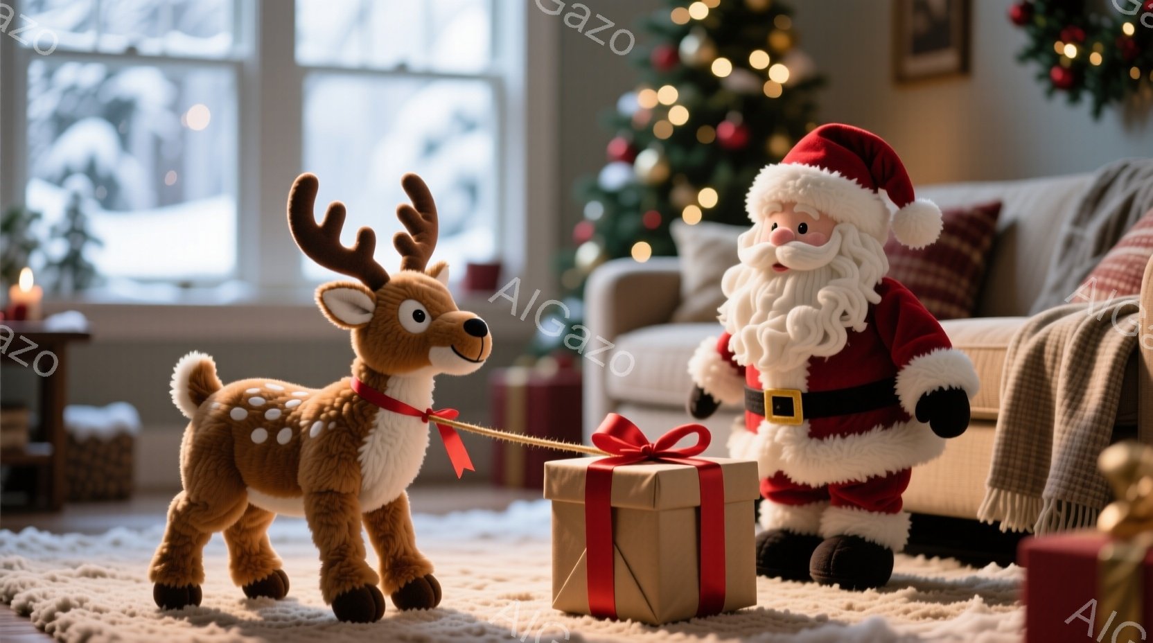 暖炉のあるリビングルームで、サンタクロースがプレゼントを抱え、トナカイの人形に赤いリボンを結び付けています。サンタクロースは赤い衣装と白いひげ、笑顔で、トナカイは愛らしい表情で立っています。背景にはクリスマスツリーやプレゼントの箱が見え、暖かく幸せなクリスマスの雰囲気が漂っています。