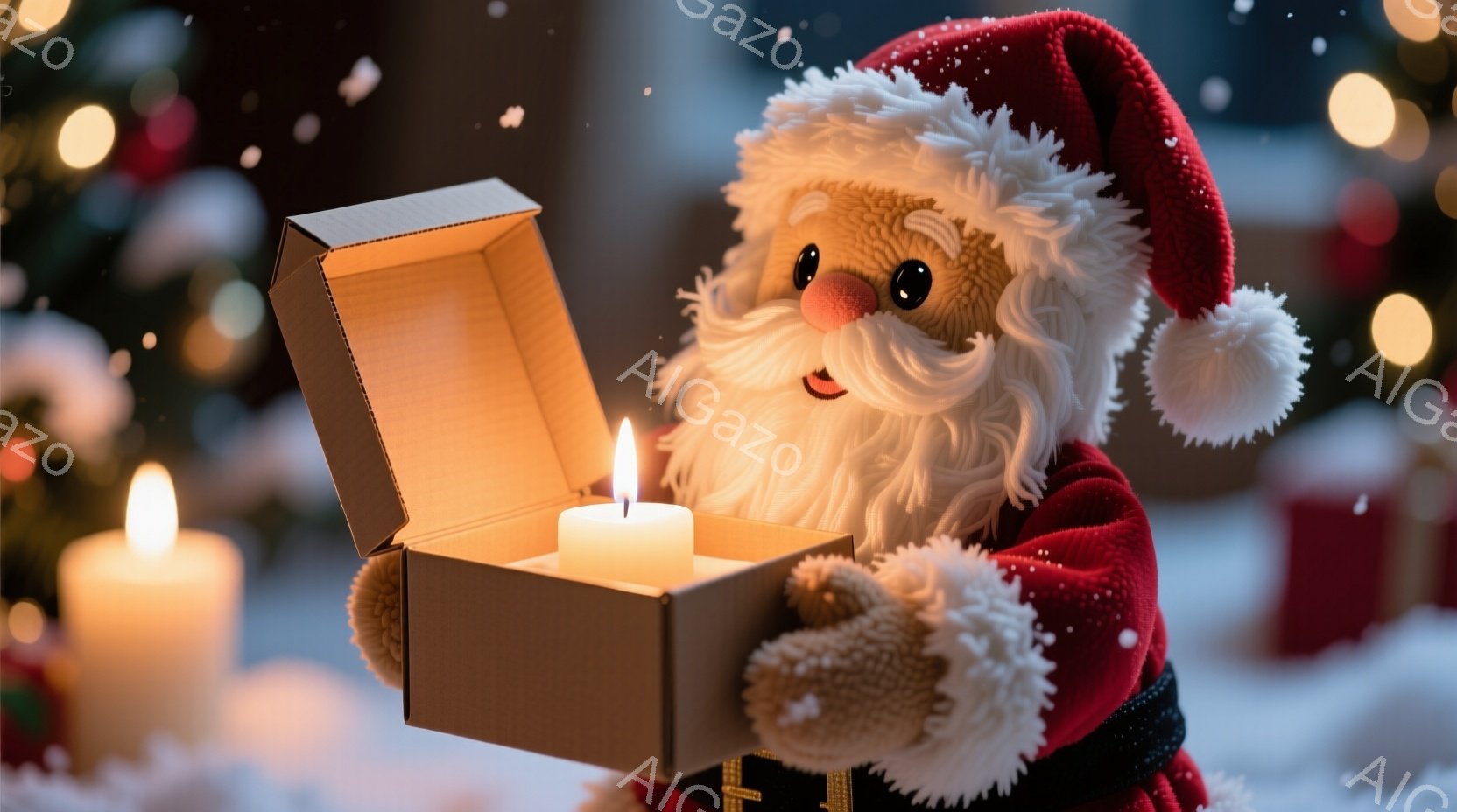 ふわふわの白いひげと笑顔が印象的なサンタクロースの人形が、赤いリボンで飾られた開いた箱を持っています。背景にはぼやけたクリスマスツリーとロウソクの光があり、雪が舞う幻想的な雰囲気を醸し出しています。全体的に温かく、お祝いムードに満ちたイメージです。
