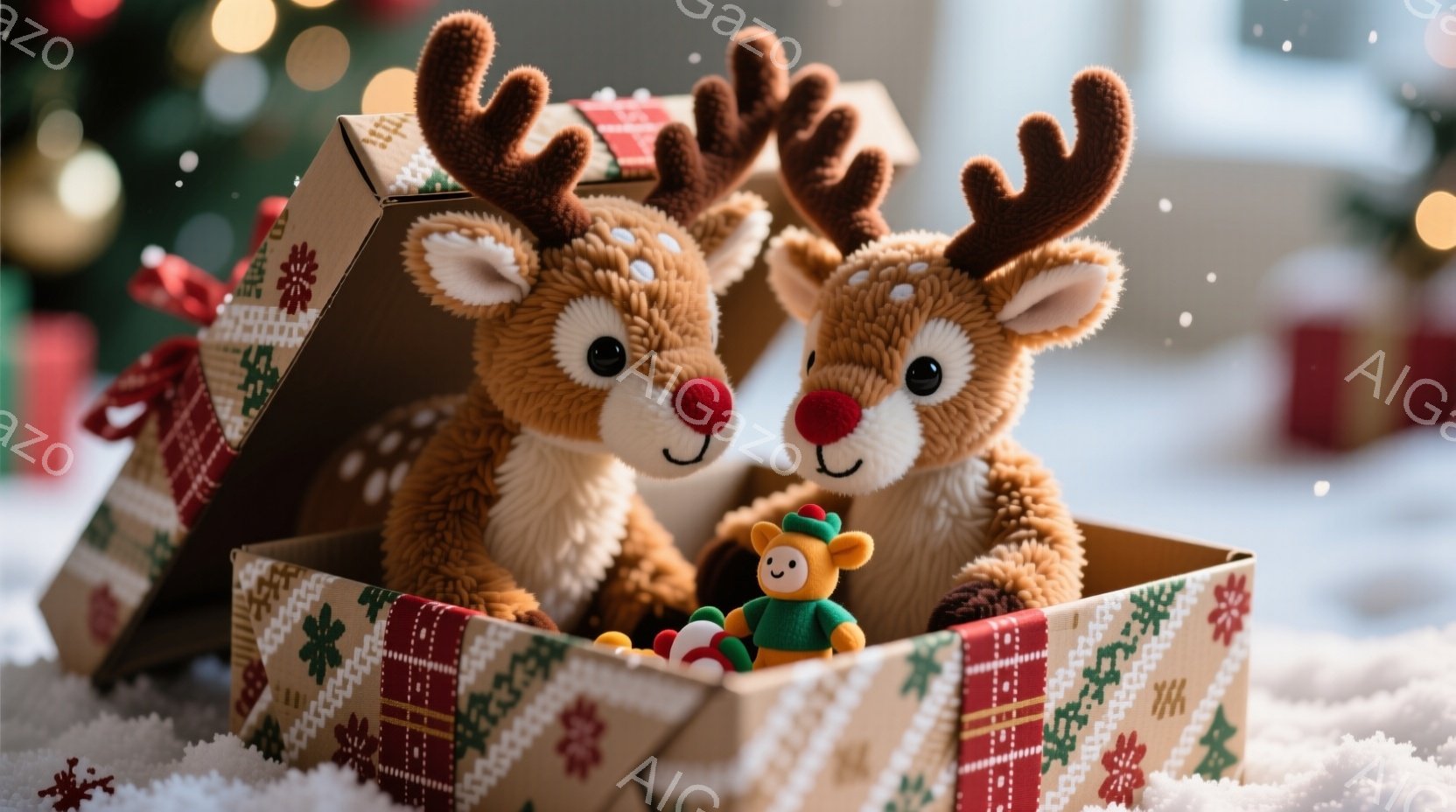 ぬいぐるみ2匹が、赤、緑、白の格子模様のギフトボックスの中から覗いています。大きな鹿のぬいぐるみは茶色と白の毛並みで、小さな子鹿のぬいぐるみは緑の小さなスカーフを巻いています。背景にはぼやけたクリスマスツリーが見え、雪が降っているような白い粒子が散らばっており、暖かく、お祝いの雰囲気が漂っています。