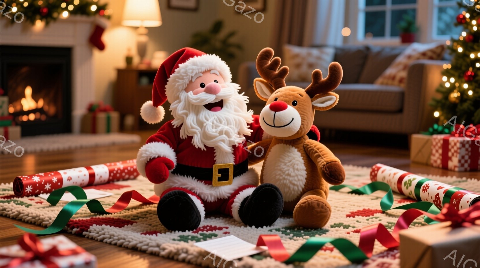 暖炉のあるリビングルームの床に、サンタクロースとトナカイのぬいぐるみ2体が寄り添って座っています。サンタクロースは赤い衣装に白い髭を生やし、トナカイは茶色い毛並みに大きな角を持っています。背景にはクリスマスツリーやプレゼントが飾られ、暖かくお祝いムードの空間が広がっています。
