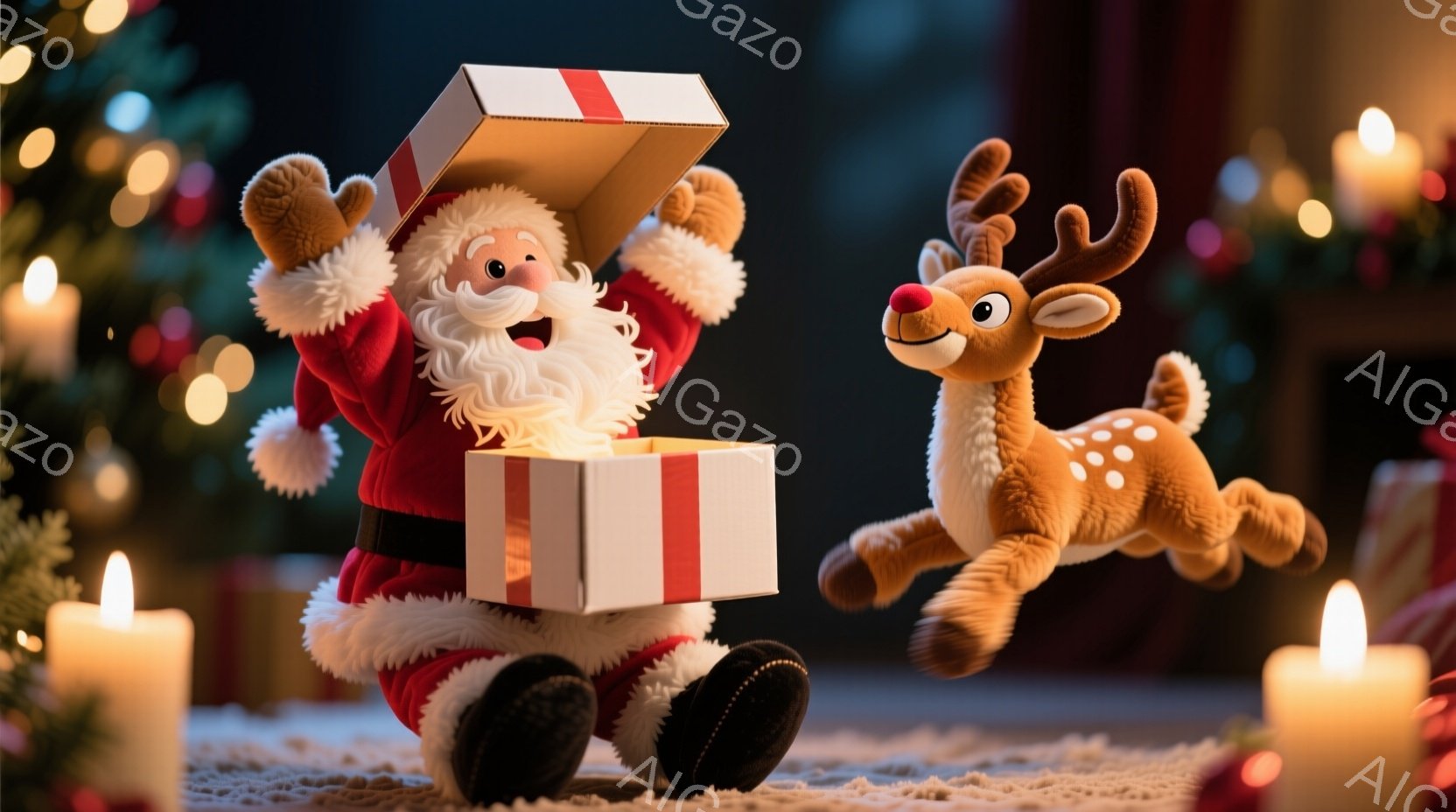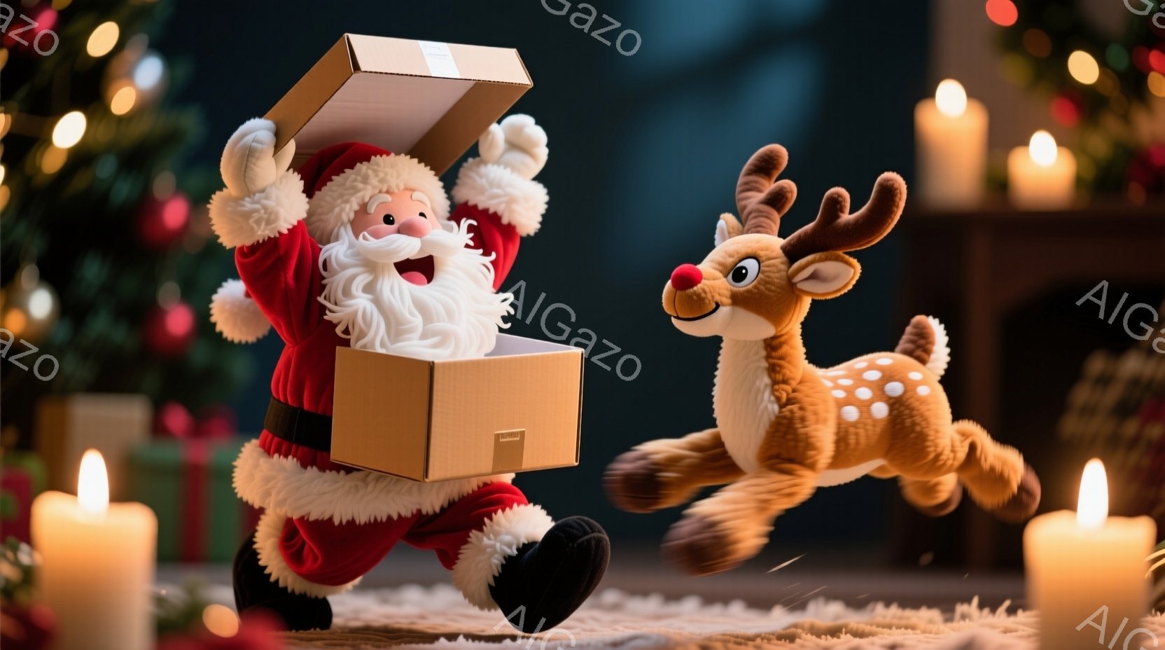 サンタクロースは赤い衣装と白い髭を蓄え、黒いブーツを履いています。彼は両手を上げて開いた段ボール箱を持っており、嬉しそうな表情をしています。背景には、ぼやけたクリスマスツリーやろうそくが配置され、暖かく、お祝いの雰囲気です。
