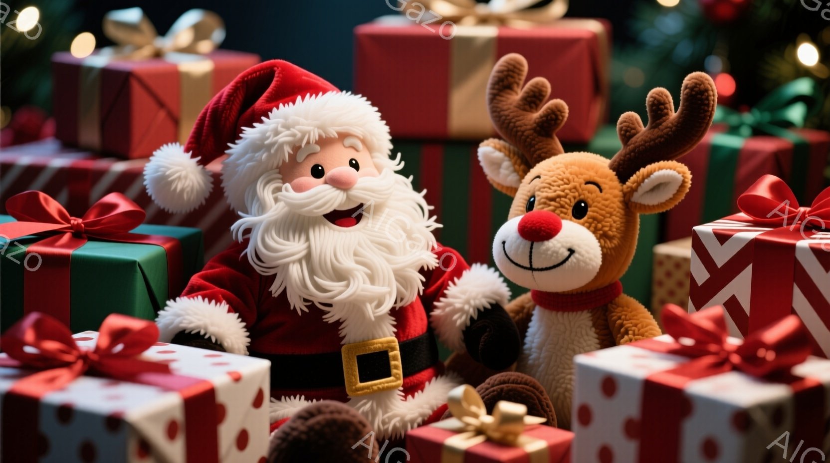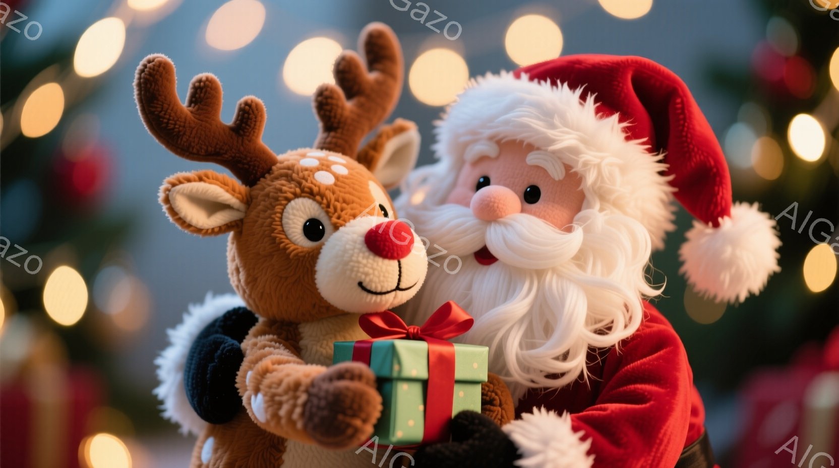 サンタクロースは赤い衣装を着て、白いひげを生やしています。彼は茶色のトナカイのぬいぐるみと抱き合い、青いリボンで結ばれた緑色のプレゼントを手に持っています。背景にはぼやけたクリスマスツリーのライトがあり、全体的に暖かく、お祝いの雰囲気です。