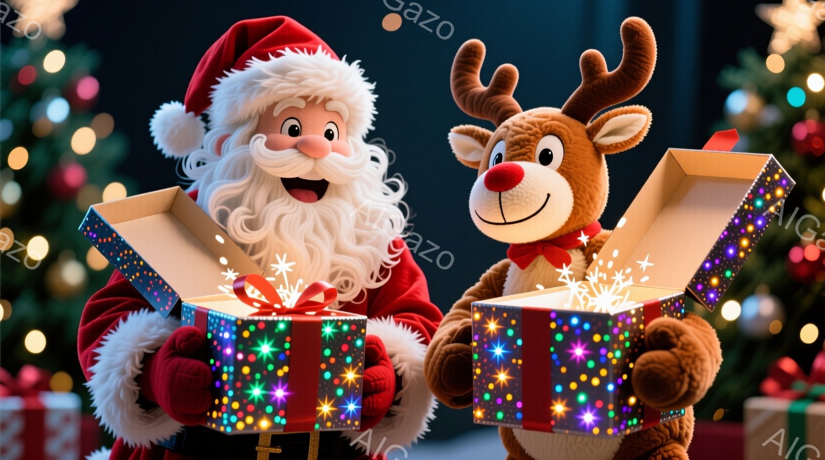サンタクロースとトナカイのぬいぐるみが、開いたギフトボックスをそれぞれ持っています。サンタは赤い衣装と白いひげ、ふくよかな体型で、明るい笑顔を浮かべています。背景には、ぼやけたクリスマスツリーと光の輝きがあり、全体的に暖かく、お祝いの雰囲気です。