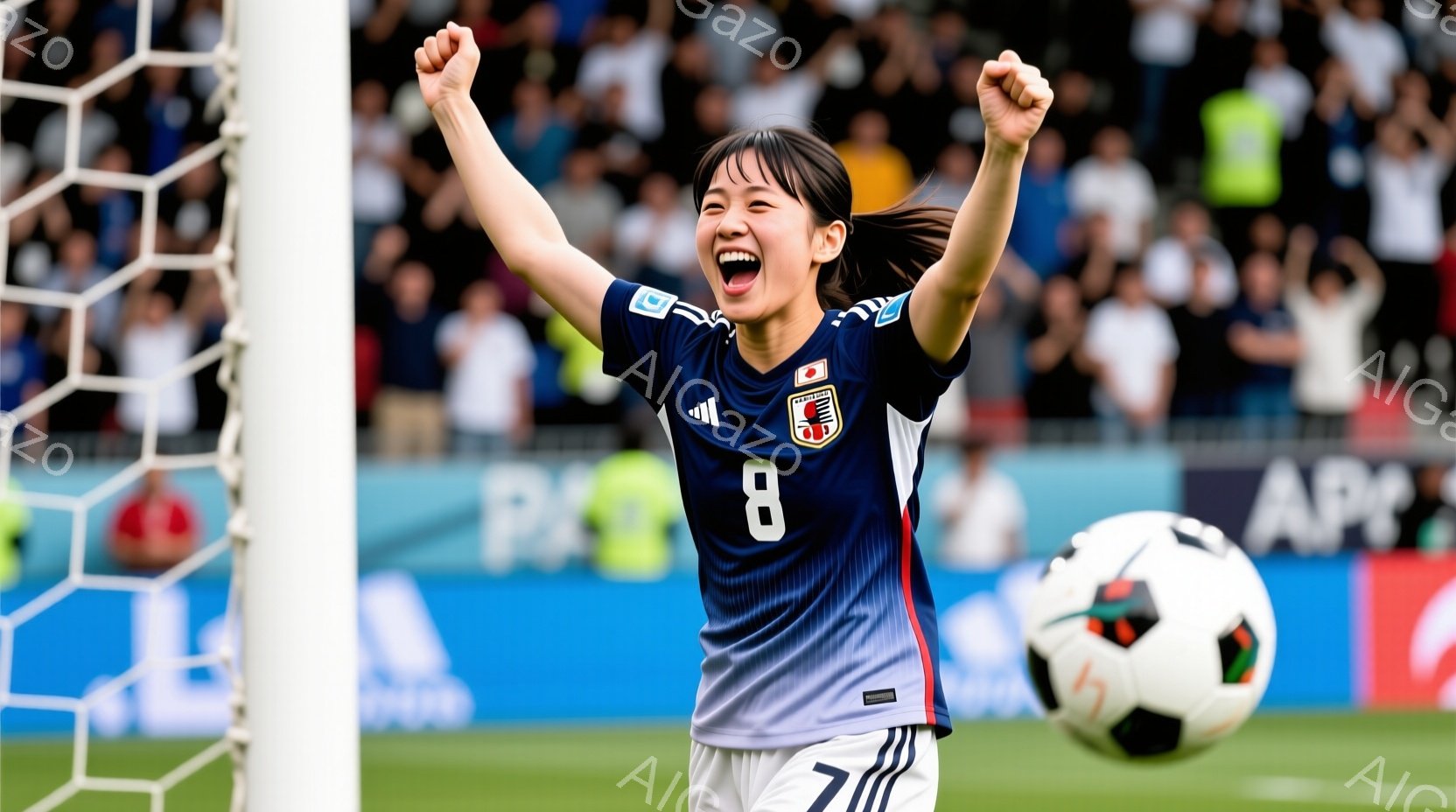 サッカーのユニフォームを着た若い女性選手が、ゴールネットの前で両手を高く上げて歓喜しています。彼女は黒髪をポニーテールにし、満面の笑みを浮かべており、その表情からは勝利への喜びが伝わってきます。背景には観客席が見え、試合の興奮と熱狂的な雰囲気が感じられます。