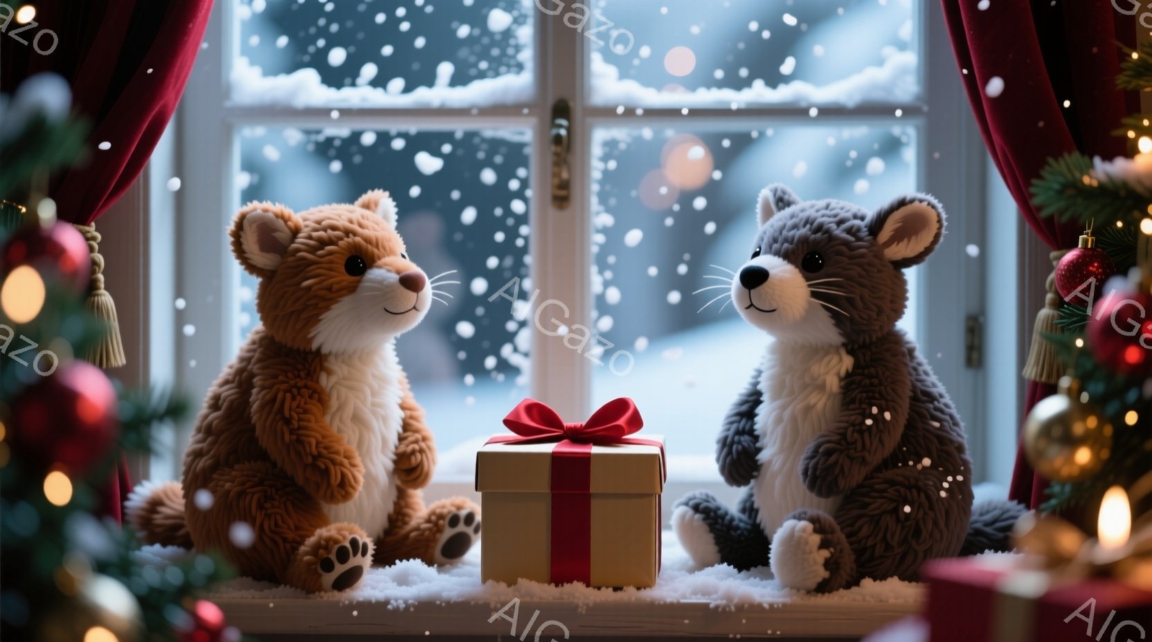 ふわふわの茶色のモモンガが2匹、赤いリボンで結ばれたプレゼントの箱を挟んで座っています。背景には雪景色が見える窓と、赤いオーナメントで飾られたクリスマスツリーがあり、温かく穏やかなクリスマスの雰囲気が漂っています。モモンガたちは顔を見合わせ、楽しげな表情でプレゼントに興味を示しています。