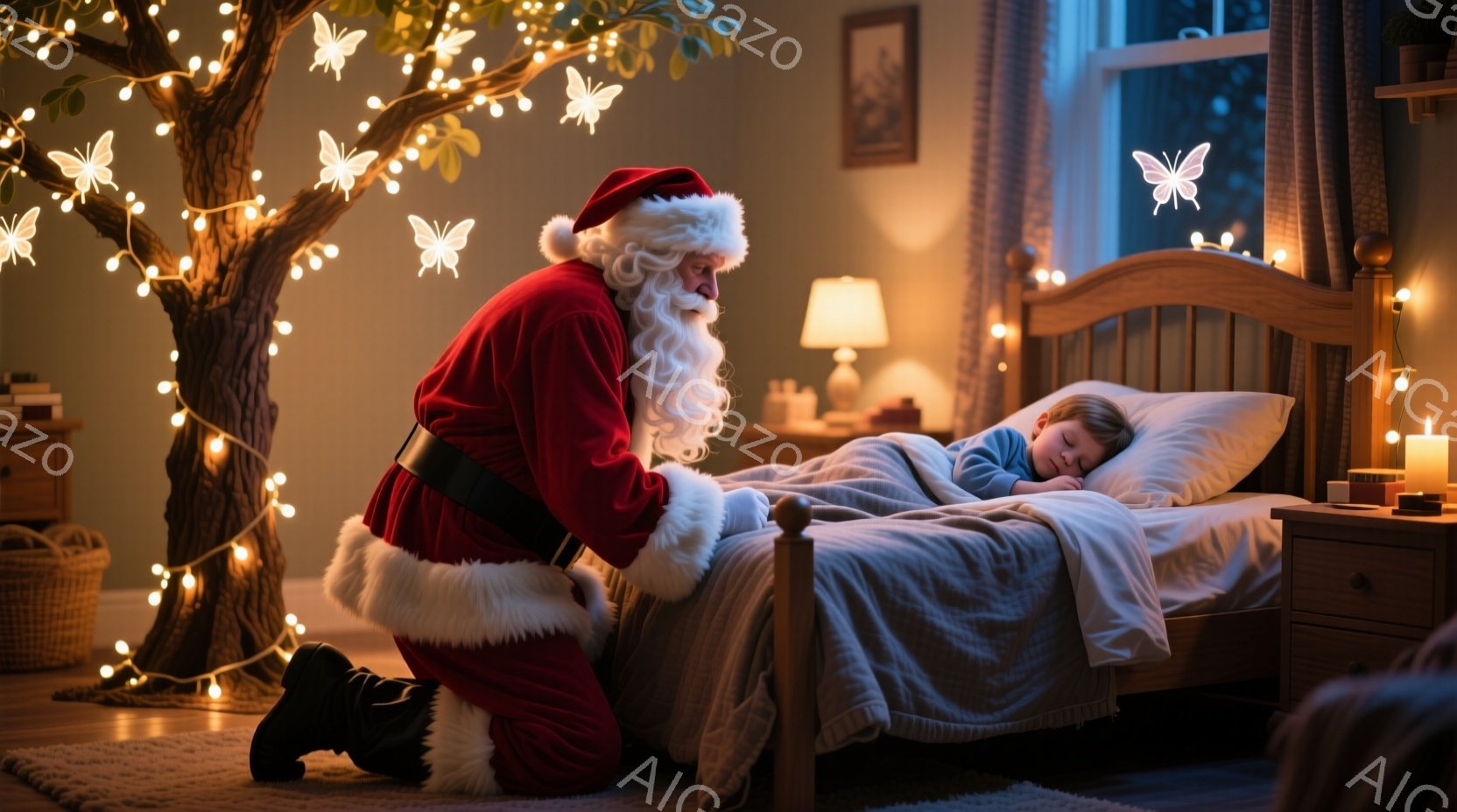 サンタクロースは、赤い衣装と白い髭を蓄えた姿で、子供が眠っているベッドのそばに膝をついています。彼は優しく微笑みながら、子供の手を握っているようです。背景には、装飾された部屋と、電飾で飾られた木があり、暖かく幻想的な雰囲気を醸し出しています。