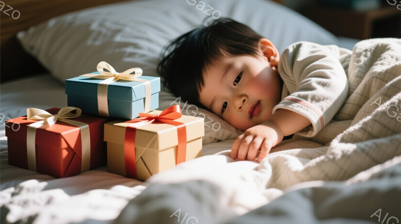 白いベッドの上に、カラフルなリボンで飾られた3つのギフトボックスが置かれています。幼い男の子が白い毛布に包まれ、リラックスした表情で目を細めて横たわっています。全体的に、暖かく穏やかな、安らぎを感じさせる雰囲気です。