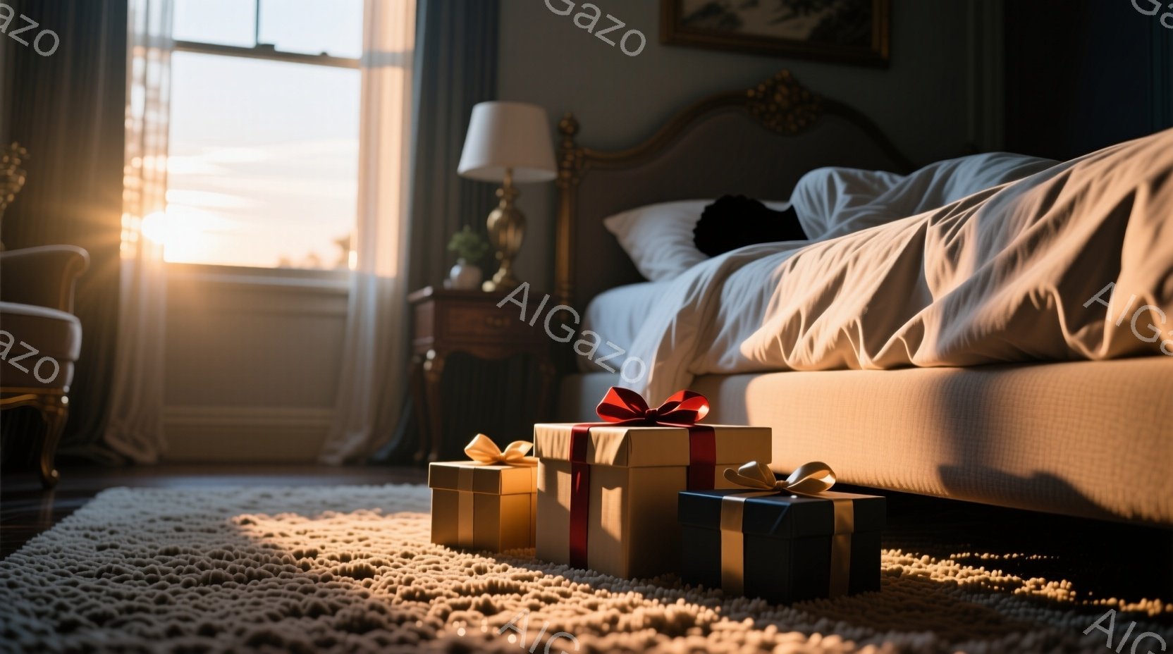 この無料AI生成画像「ベッドの上で女性が仰向けに横たわっており、黒い服と靴下を身につけています。背景には夕焼けが見え、室内は暖かく穏やかな光に包まれています。ベッドの足元には、リボンのかかったプレゼントボックスがいくつか置かれ、特別な日の到来を予感させる雰囲気です。」は、2025年10月29日に作成されました。 サイズは 1664×928px の高解像度で、商用利用も可能なフリー素材として提供しています。