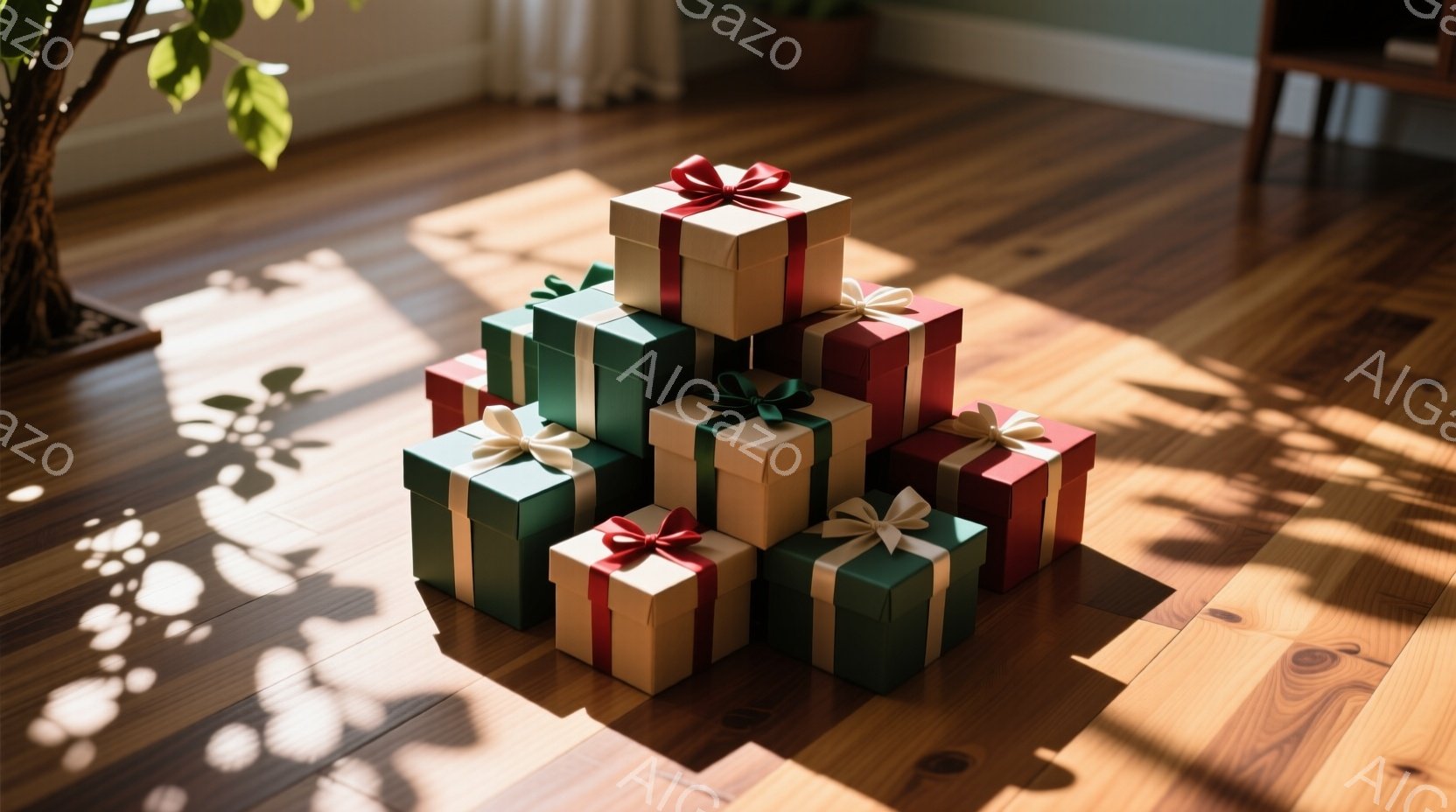 木の床の上に、様々な色のギフトボックスが積み重ねられています。赤、緑、ベージュのボックスにはそれぞれリボンが結ばれており、プレゼントの準備ができている様子が伺えます。背景には家具の一部が見え、温かみのある室内で穏やかな雰囲気が漂っています。