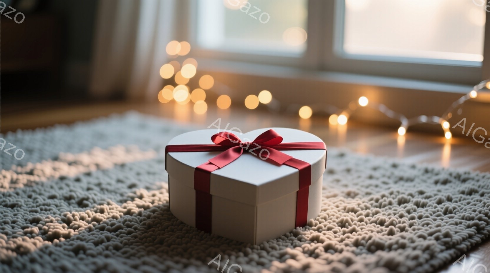 心型のギフトボックスが、オフホワイトのモコモコしたラグの上に置かれています。箱は白と赤の二色で、赤いリボンが可愛らしく結ばれています。背景にはぼやけた光のストリングライトと窓が見え、温かくロマンチックな雰囲気です。