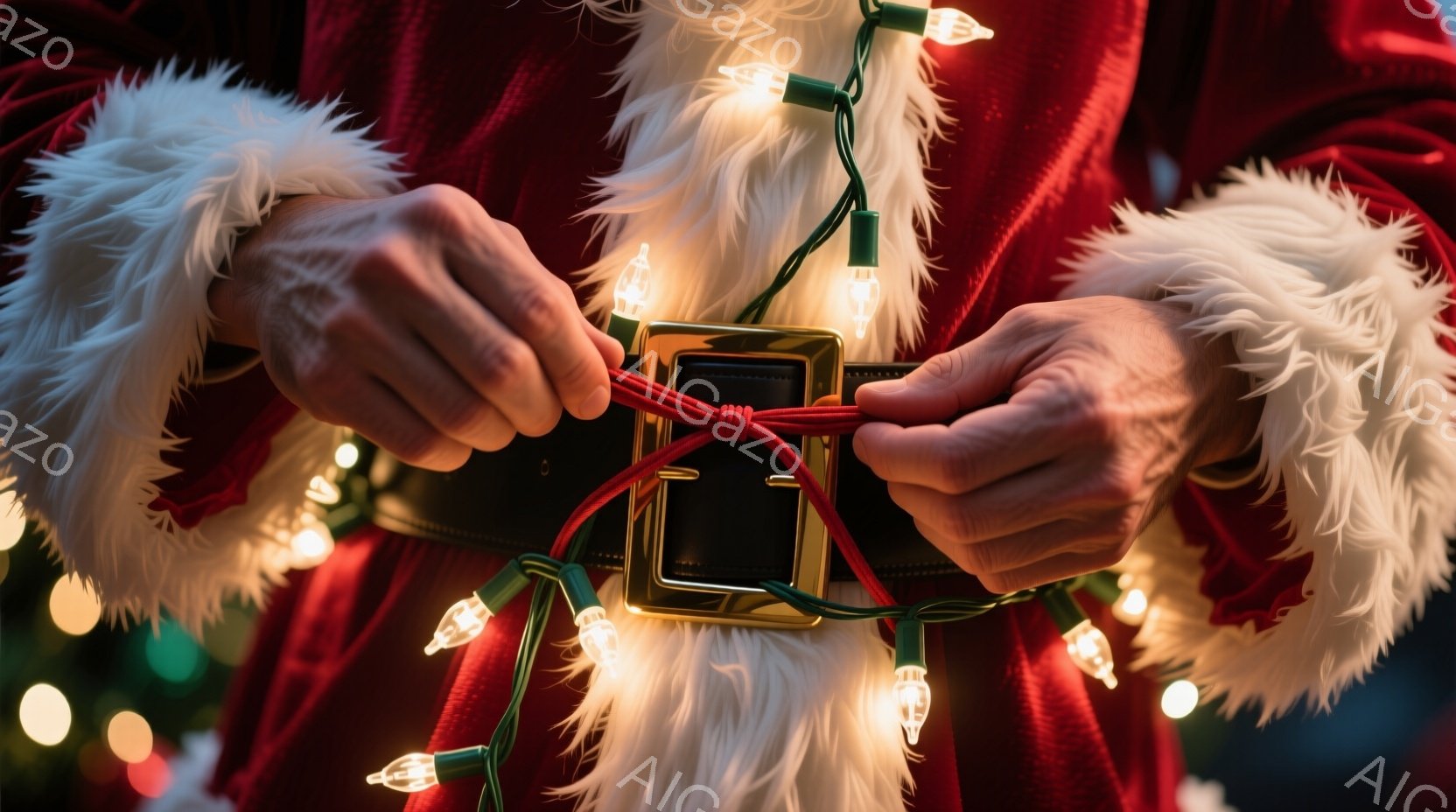 赤い衣装を着た人物が、クリスマスの電飾をベルトに巻き付けようとしています。白いふわふわの毛皮のトリムが袖に付いており、金のバックルが際立っています。背景にはぼやけた緑色のクリスマスツリーと、温かい光のぼかしがあり、祝祭的な雰囲気を醸し出しています。