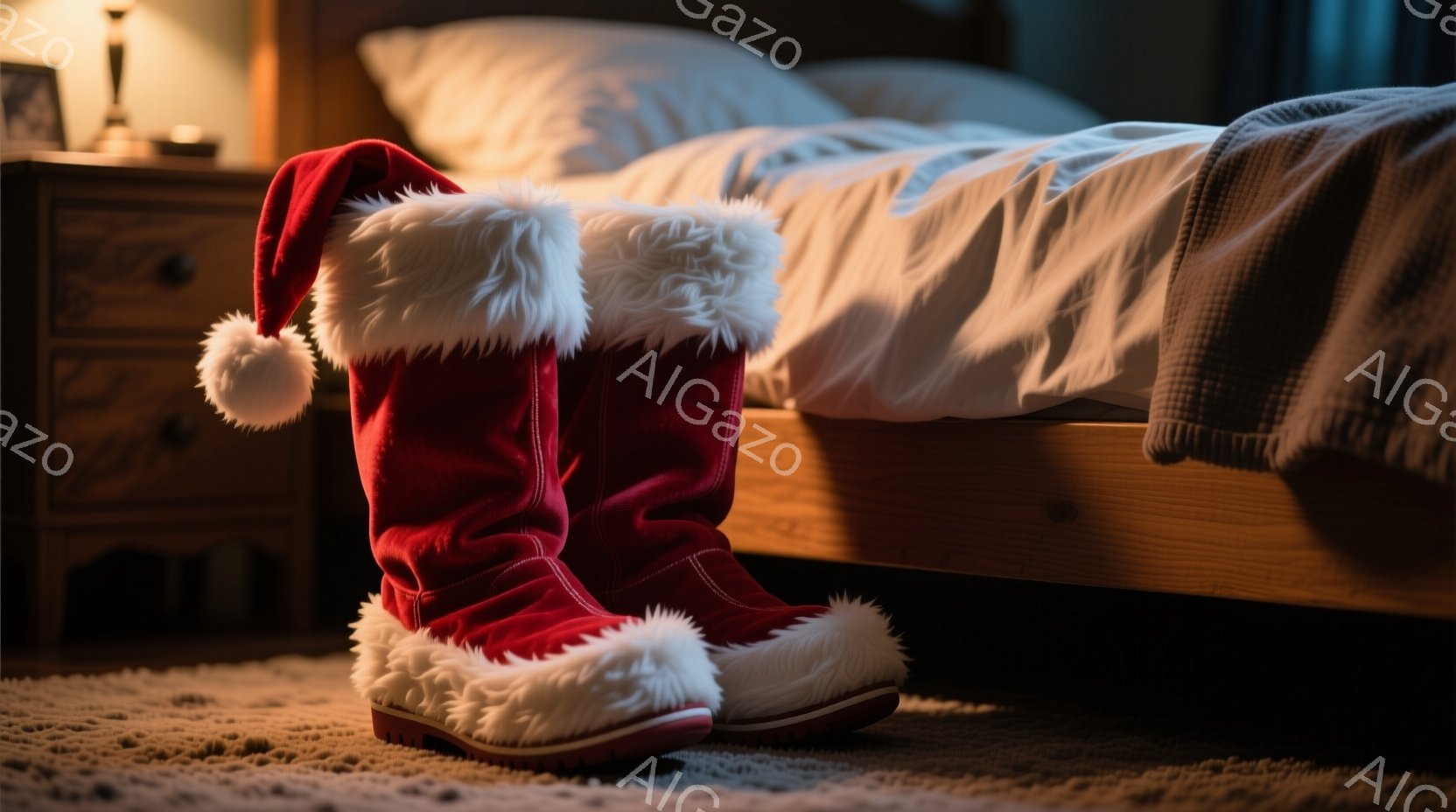 鮮やかな赤いサンタクロースのブーツが、薄暗い部屋の床に置かれています。背景には、ベッドとサイドテーブルが見え、暖色の光がぼんやりと灯っています。全体的に、クリスマスの静かで落ち着いた雰囲気が漂っています。