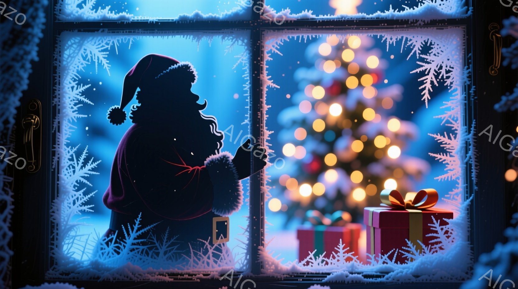 サンタクロースが赤い衣装を着て、毛皮の縁取りが付いた帽子をかぶり、長い白いひげを蓄えています。彼は大きな麻袋を肩に担ぎ、雪の降る夜に窓の外を見つめています。背景には、温かい光が灯った室内のベッドルームと、月明かりの下の雪景色が広がっており、暖かく幻想的な雰囲気を醸し出しています。