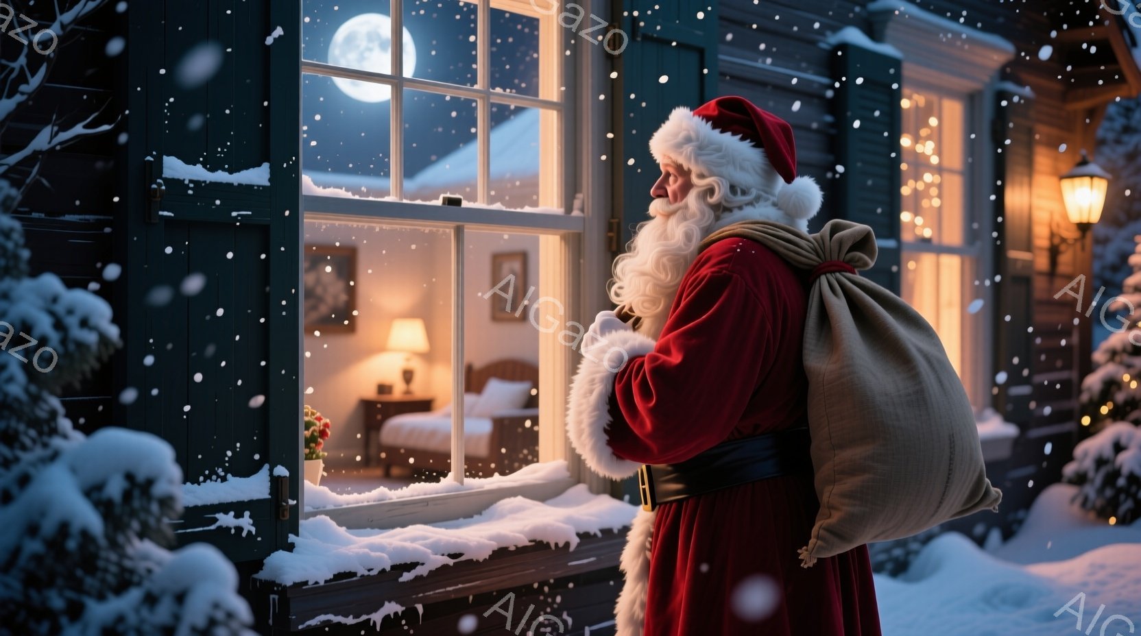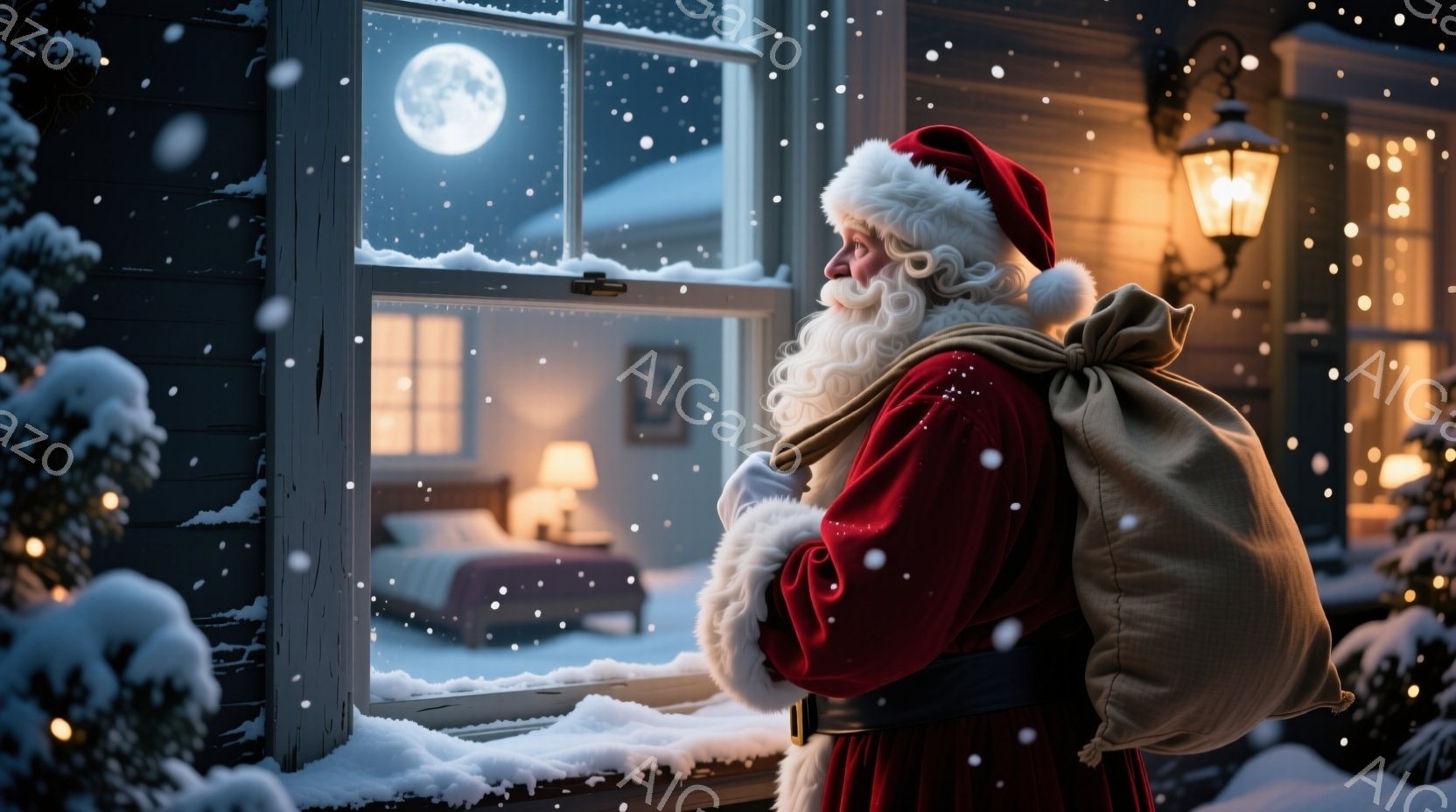 サンタクロースが赤い衣装と白いひげをたくわえ、大きな麻袋を肩に担いで、雪に覆われた家の窓辺に立っている。窓の内には暖かく光る部屋があり、ベッドが整えられている。雪が降り積もり、夜空には満月が輝き、静かで幻想的な雰囲気が漂っている。